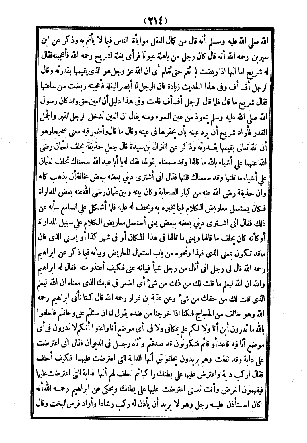 اللَّهِ - صَلَّى اللَّهُ عَلَيْهِ وَسَلَّمَ - أَنَّهُ قَالَ «مِنْ كَمَالِ الْعَقْلِ مُوَابَأَةُ النَّاسِ فِيمَا لَا يَأْثَمُ بِهِ» وَذُكِرَ عَنْ ابْنِ سِيرِينَ - رَحِمَهُ اللَّهُ - أَنَّهُ قَالَ كَانَ رَجُلٌ مِنْ بَاهِلَةَ عَيُونًا فَرَأَى بَغْلَةً لِشُرَيْحٍ - رَحِمَهُ اللَّهُ - فَأَعْجَبَتْهُ فَقَالَ لَهُ شُرَيْحٌ أَمَا إنَّهَا إذَا رَبَضَتْ لَمْ تَقُمْ حَتَّى تُقَامَ أَيْ أَنَّ اللَّهَ عَزَّ وَجَلَّ هُوَ الَّذِي يُقِيمُهَا بِقُدْرَتِهِ، وَقَالَ الرَّجُلُ: أُفٍّ أُفٍّ، وَفِي هَذَا الْحَدِيثِ زِيَادَةٌ فَإِنَّ الرَّجُلَ لَمَّا أَبْصَرَ الْبَغْلَةَ فَأَعْجَبَتْهُ رَبَضَتْ مِنْ سَاعَتِهَا فَقَالَ شُرَيْحٌ مَا قَالَ فَلَمَّا قَالَ الرَّجُلُ: أُفٍّ أُفٍّ قَامَتْ.
