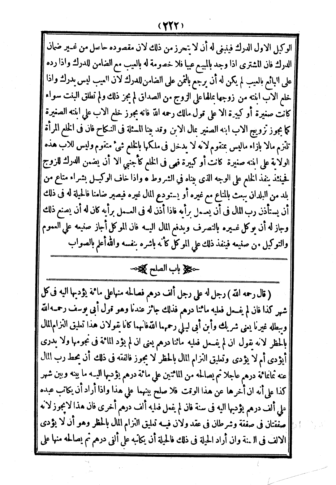 (قَالَ - رَحِمَهُ اللَّهُ -) رَجُلٌ لَهُ عَلَى رَجُلٍ أَلْفُ دِرْهَمٍ فَصَالَحَهُ مِنْهَا عَلَى مِائَةٍ يُؤَدِّيهَا إلَيْهِ فِي كُلِّ شَهْرٍ كَذَا، فَإِنْ لَمْ يَفْعَلْ فَعَلَيْهِ مِائَتَا دِرْهَمٍ فَذَلِكَ جَائِزٌ عِنْدَنَا، وَهُوَ قَوْلُ أَبِي يُوسُفَ - رَحِمَهُ اللَّهُ - وَيُبْطِلُهُ غَيْرُنَا يَعْنِي شَرِيكًا وَابْنَ أَبِي لَيْلَى رَحِمَهُمَا اللَّهُ فَإِنَّهُمَا كَانَا يَقُولَانِ: هَذَا تَعْلِيقُ الْتِزَامِ الْمَالِ بِالْحَظْرِ؛ لِأَنَّهُ يَقُولُ: إنْ لَمْ يَفْعَلْ فَعَلَيْهِ مِائَتَا دِرْهَمٍ يَعْنِي إنْ لَمْ يُؤَدِّ الْمِائَةَ فِي نُجُومِهَا، وَلَا يَدْرِي أَيُؤَدِّي أَمْ لَا يُؤَدِّي وَتَعْلِيقُ الْتِزَامِ الْمَالِ بِالْحَظْرِ لَا يَجُوزُ فَالْفِقْهُ فِي ذَلِكَ أَنْ يَحُطَّ رَبُّ الْمَالِ عَنْهُ ثَمَانِمِائَةِ دِرْهَمٍ عَاجِلًا ثُمَّ يُصَالِحَهُ مِنْ الْمِائَتَيْنِ عَلَى مِائَةِ دِرْهَمٍ يُؤَدِّيهَا إلَيْهِ مَا بَيْنَهُ وَبَيْنَ شَهْرِ كَذَا عَلَى أَنَّهُ إنْ أَخَّرَهَا عَنْ هَذَا الْوَقْتِ فَلَا صُلْحَ بَيْنَهُمَا عَلَى هَذَا.