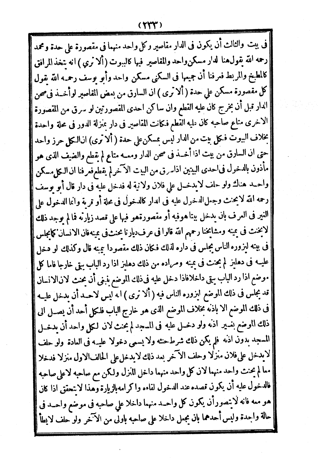 (أَلَا تَرَى) أَنَّ السَّارِقَ مِنْ بَعْضِ الْمَقَاصِيرِ لَوْ أَخَذَ فِي صَحْنِ الدَّارِ قَبْلَ أَنْ يَخْرُجَ كَانَ عَلَيْهِ الْقَطْعُ، وَإِنَّ سَاكِنَ إحْدَى الْمَقْصُورَتَيْنِ لَوْ سَرَقَ مِنْ الْمَقْصُورَةِ الْأُخْرَى مَتَاعَ صَاحِبِهِ كَانَ عَلَيْهِ الْقَطْعُ؟ فَكَانَتْ الْمَقَاصِيرُ فِي دَارٍ بِمَنْزِلَةِ الدُّورِ فِي مَحَلَّةٍ وَاحِدَةٍ بِخِلَافِ الْبُيُوتِ فَكُلُّ بَيْتٍ مِنْ الدَّارِ لَيْسَ بِمَسْكَنٍ عَلَى حِدَةٍ.