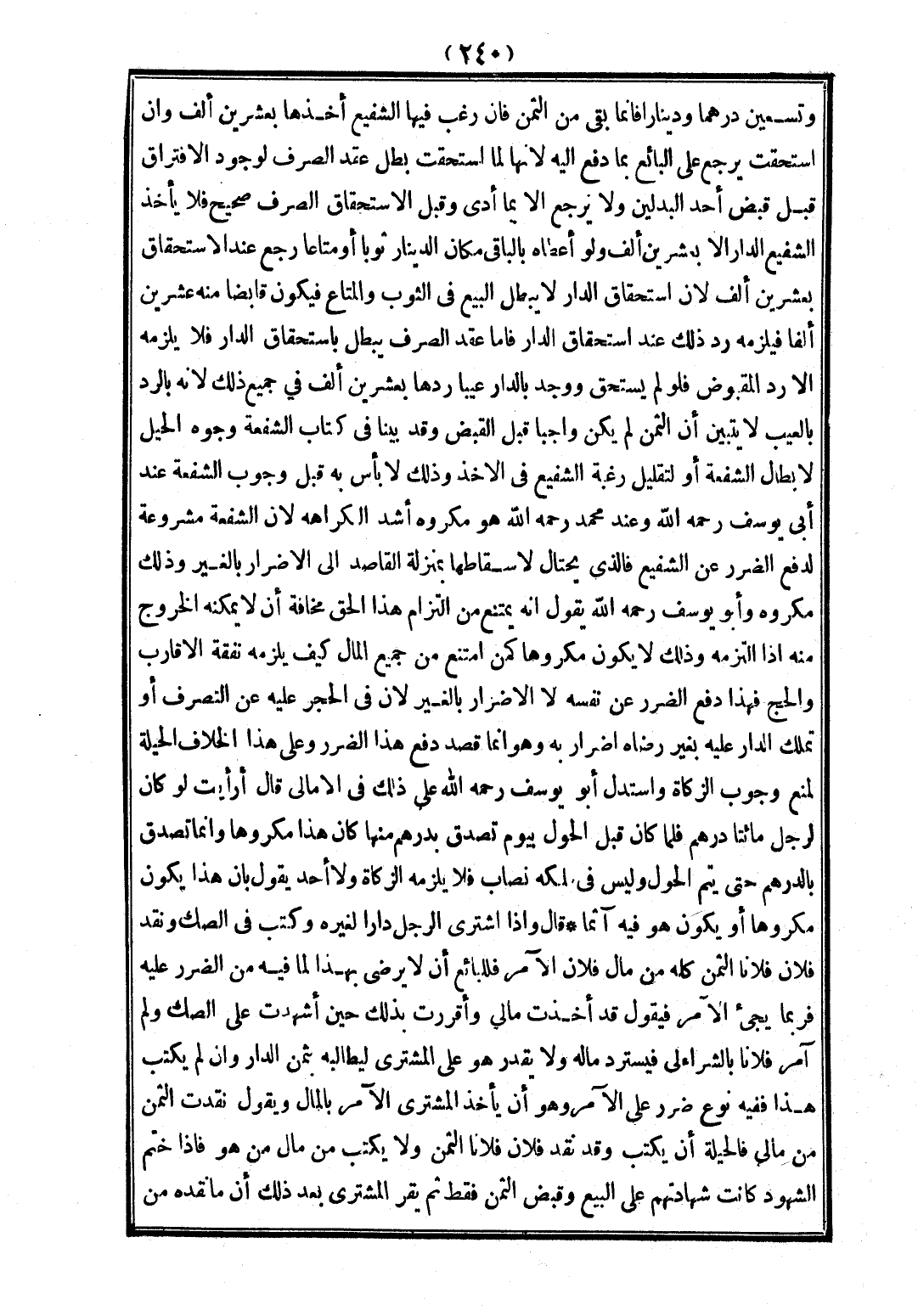 وَتِسْعِينَ دِرْهَمًا وَدِينَارًا، فَإِنَّمَا بَقِيَ مِنْ الثَّمَنِ فَإِنْ رَغِبَ فِيهَا الشَّفِيعُ أَخَذَهَا بِعِشْرِينَ أَلْفٍ، وَإِنْ اُسْتُحِقَّتْ يَرْجِعُ عَلَى الْبَائِعِ بِمَا دَفَعَ إلَيْهِ؛ لِأَنَّهَا لَمَّا اُسْتُحِقَّتْ بَطَلَ عَقْدُ الصَّرْفِ لِوُجُودِ الِافْتِرَاقِ قَبْلَ قَبْضِ أَحَدِ الْبَدَلَيْنِ، وَلَا يَرْجِعُ إلَّا بِمَا أَدَّى وَقَبْلَ الِاسْتِحْقَاقِ الصَّرْفُ صَحِيحٌ فَلَا يَأْخُذُ الشَّفِيعُ الدَّارَ إلَّا بِعِشْرِينَ أَلْفٍ، وَلَوْ أَعْطَاهُ بِالْبَاقِي مَكَانَ الدِّينَارِ ثَوْبًا أَوْ مَتَاعًا رَجَعَ عِنْدَ الِاسْتِحْقَاقِ بِعِشْرِينَ أَلْفٍ؛ لِأَنَّ اسْتِحْقَاقَ الدَّارِ لَا يُبْطِلُ الْبَيْعَ فِي الثَّوْبِ وَالْمَتَاعِ فَيَكُونُ قَابِضًا مِنْهُ عِشْرِينَ أَلْفٍ فَيَلْزَمُهُ رَدُّ ذَلِكَ عِنْدَ اسْتِحْقَاقِ الدَّارِ فَأَمَّا عَقْدُ الصَّرْفِ يَبْطُلُ بِاسْتِحْقَاقِ الدَّارِ فَلَا يَلْزَمُهُ إلَّا رَدُّ الْمَقْبُوضِ، فَلَوْ لَمْ يُسْتَحَقَّ وَوَجَدَ بِالدَّارِ عَيْبًا رَدَّهَا بِعِشْرِينَ أَلْفٍ فِي جَمِيعِ ذَلِكَ؛ لِأَنَّهُ بِالرَّدِّ بِالْعَيْبِ لَا يَتَبَيَّنُ أَنَّ الثَّمَنَ لَمْ يَكُنْ وَاجِبًا قَبْلَ الْقَبْضِ، وَقَدْ بَيَّنَّا فِي كِتَابِ الشُّفْعَةِ وُجُوهَ الْحِيَلِ لِإِبْطَالِ الشُّفْعَةِ أَوْ لِتَقْلِيلِ رَغْبَةِ الشَّفِيعِ فِي الْأَخْذِ، وَذَلِكَ لَا بَأْسَ بِهِ قَبْلَ وُجُوبِ الشُّفْعَةِ عِنْدَ أَبِي يُوسُفَ - رَحِمَهُ اللَّهُ -، وَعِنْدَ مُحَمَّدٍ - رَحِمَهُ اللَّهُ - هُوَ مَكْرُوهٌ أَشَدَّ الْكَرَاهَةِ؛ لِأَنَّ الشُّفْعَةَ مَشْرُوعَةٌ لِدَفْعِ الضَّرَرِ عَنْ الشَّفِيعِ فَاَلَّذِي يَحْتَالُ لِإِسْقَاطِهَا بِمَنْزِلَةِ الْقَاصِدِ إلَى الْإِضْرَارِ بِالْغَيْرِ، وَذَلِكَ مَكْرُوهٌ وَأَبُو يُوسُفَ - رَحِمَهُ اللَّهُ - يَقُولُ: إنَّهُ يَمْتَنِعُ مِنْ الْتِزَامِ هَذَا الْحَقِّ مَخَافَةَ أَنْ لَا يُمْكِنَهُ الْخُرُوجُ مِنْهُ إذَا الْتَزَمَهُ، وَذَلِكَ لَا يَكُونُ مَكْرُوهًا كَمَنْ امْتَنَعَ مِنْ جَمِيعِ الْمَالِ كَيْفَ يَلْزَمُهُ نَفَقَةُ الْأَقَارِبِ وَالْحَجِّ؟ فَهَذَا دَفْعُ الضَّرَرِ عَنْ نَفْسِهِ لَا الْإِضْرَارُ بِالْغَيْرِ؛ لِأَنَّ فِي الْحَجْرِ عَلَيْهِ عَنْ التَّصَرُّفِ أَوْ تَمَلُّكِ الدَّارِ عَلَيْهِ بِغَيْرِ رِضَاهُ إضْرَارٌ بِهِ، وَهُوَ إنَّمَا قَصَدَ دَفْعَ هَذَا الضَّرَرِ وَعَلَى هَذَا الْخِلَافِ الْحِيلَةُ لِمَنْعِ وُجُوبِ الزَّكَاةِ وَاسْتَدَلَّ أَبُو يُوسُفَ - رَحِمَهُ اللَّهُ - عَلَى ذَلِكَ فِي الْأَمَالِي قَالَ: أَرَأَيْت لَوْ كَانَ لِرَجُلٍ مِائَتَا دِرْهَمٍ فَلَمَّا كَانَ قَبْلَ الْحَوْلِ بِيَوْمٍ تَصَدَّقَ بِدِرْهَمٍ مِنْهَا كَانَ هَذَا مَكْرُوهًا، وَإِنَّمَا تَصَدَّقَ بِالدِّرْهَمِ حَتَّى يَتِمَّ الْحَوْلُ وَلَيْسَ فِي مِلْكِهِ نِصَابٌ فَلَا يَلْزَمُهُ الزَّكَاةُ، وَلَا أَحَدٌ يَقُولُ بِأَنَّ هَذَا يَكُونُ مَكْرُوهًا أَوْ يَكُونُ هُوَ فِيهِ آثِمًا