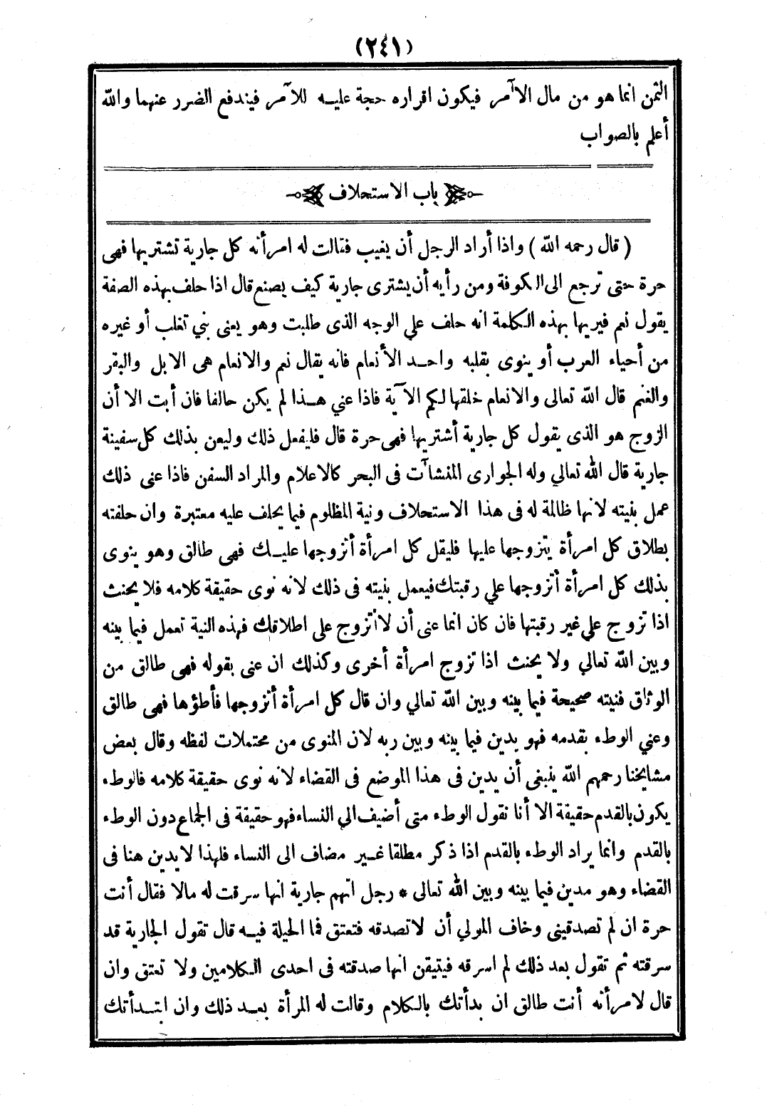 (قَالَ - رَحِمَهُ اللَّهُ -) وَإِذَا أَرَادَ الرَّجُلُ أَنْ يَغِيبَ فَقَالَتْ لَهُ امْرَأَتُهُ: كُلُّ جَارِيَةٍ تَشْتَرِيهَا فَهِيَ حُرَّةٌ حَتَّى تَرْجِعَ إلَى الْكُوفَةِ، وَمِنْ رَأْيِهِ أَنْ يَشْتَرِيَ جَارِيَةً كَيْفَ يَصْنَعُ؟ قَالَ: إذَا حَلَفَ بِهَذِهِ الصِّفَةِ يَقُولُ: نَعَمْ فَيُرِيهَا بِهَذِهِ الْكَلِمَةِ أَنَّهُ حَلَفَ عَلَى الْوَجْهِ الَّذِي طَلَبَتْ، وَهُوَ يَعْنِي بَنِي تَغْلِبَ أَوْ غَيْرَهُ مِنْ أَحْيَاءِ الْعَرَبِ أَوْ يَنْوِي بِقَلْبِهِ وَاحِدَ الْأَنْعَامِ، فَإِنَّهُ يُقَالُ نَعَمْ وَالْأَنْعَامُ هِيَ الْإِبِلُ وَالْبَقَرُ وَالْغَنَمُ قَالَ اللَّهُ تَعَالَى {وَالْأَنْعَامَ خَلَقَهَا لَكُمْ} [النحل: 5] الْآيَةَ، فَإِذَا عَنَى هَذَا لَمْ يَكُنْ حَالِفًا فَإِنْ أَبَتْ إلَّا أَنَّ الزَّوْجَ هُوَ الَّذِي يَقُولُ: كُلُّ جَارِيَةٍ أَشْتَرِيهَا فَهِيَ حُرَّةٌ، قَالَ: فَلْيَفْعَلْ ذَلِكَ وَلْيَعْنِ بِذَلِكَ كُلَّ سَفِينَةٍ جَارِيَةٍ قَالَ اللَّهُ تَعَالَى {وَلَهُ الْجَوَارِ الْمُنْشَآتُ فِي الْبَحْرِ كَالْأَعْلَامِ} [الرحمن: 24] وَالْمُرَادُ السُّفُنُ، فَإِذَا عَنَى ذَلِكَ عَمِلَ بِنِيَّتِهِ؛ لِأَنَّهَا ظَالِمَةٌ لَهُ فِي هَذَا الِاسْتِحْلَافِ وَنِيَّةُ الْمَظْلُومِ فِيمَا يُحَلَّفُ عَلَيْهِ مُعْتَبَرَةٌ، وَإِنْ حَلَّفَتْهُ بِطَلَاقِ كُلِّ امْرَأَةٍ يَتَزَوَّجُهَا عَلَيْهَا فَلْيَقُلْ: كُلُّ امْرَأَةٍ أَتَزَوَّجُهَا عَلَيْك فَهِيَ طَالِقٌ، وَهُوَ يَنْوِي بِذَلِكَ كُلَّ امْرَأَةٍ أَتَزَوَّجُهَا عَلَى رَقَبَتِك فَيُعْمَلُ بِنِيَّتِهِ فِي ذَلِكَ؛ لِأَنَّهُ نَوَى حَقِيقَةَ كَلَامِهِ فَلَا يَحْنَثُ إذَا تَزَوَّجَ عَلَى غَيْرِ رَقَبَتِهَا فَإِنْ كَانَ إنَّمَا عَنَى أَنْ لَا أَتَزَوَّجَ عَلَى إطْلَاقِك فَهَذِهِ النِّيَّةُ تَعْمَلُ فِيمَا بَيْنَهُ وَبَيْنَ اللَّهِ تَعَالَى، وَلَا يَحْنَثُ إذَا تَزَوَّجَ امْرَأَةً أُخْرَى، وَكَذَلِكَ إنْ عَنَى بِقَوْلِهِ فَهِيَ طَالِقٌ مِنْ الْوَثَاقِ فَنِيَّتُهُ صَحِيحَةٌ فِيمَا بَيْنَهُ وَبَيْنَ اللَّهِ تَعَالَى، وَإِنْ قَالَ: كُلُّ امْرَأَةٍ أَتَزَوَّجُهَا فَأَطَؤُهَا فَهِيَ طَالِقٌ وَعَنَى الْوَطْءَ بِقَدَمِهِ، فَهُوَ يَدِينُ فِيمَا بَيْنَهُ وَبَيْنَ رَبِّهِ؛ لِأَنَّ الْمَنْوِيَّ مِنْ مُحْتَمَلَاتِ لَفْظِهِ، وَقَالَ بَعْضُ مَشَايِخِنَا - رَحِمَهُمُ اللَّهُ -: يَنْبَغِي أَنْ يَدِينَ فِي هَذَا الْمَوْضِعِ فِي الْقَضَاءِ؛ لِأَنَّهُ نَوَى حَقِيقَةَ كَلَامِهِ فَالْوَطْءُ يَكُونُ بِالْقَدَمِ حَقِيقَةً إلَّا أَنَّا نَقُولُ الْوَطْءُ مَتَى أُضِيفَ إلَى النِّسَاءِ، فَهُوَ حَقِيقَةٌ فِي الْجِمَاعِ دُونَ الْوَطْءِ بِالْقَدَمِ، وَإِنَّمَا يُرَادُ الْوَطْءُ بِالْقَدَمِ إذَا ذُكِرَ مُطْلَقًا غَيْرَ مُضَافٍ إلَى النِّسَاءِ، فَلِهَذَا لَا يَدِينُ هُنَا فِي الْقَضَاءِ، وَهُوَ مَدِينٌ فِيمَا بَيْنَهُ وَبَيْنَ اللَّهِ تَعَالَى