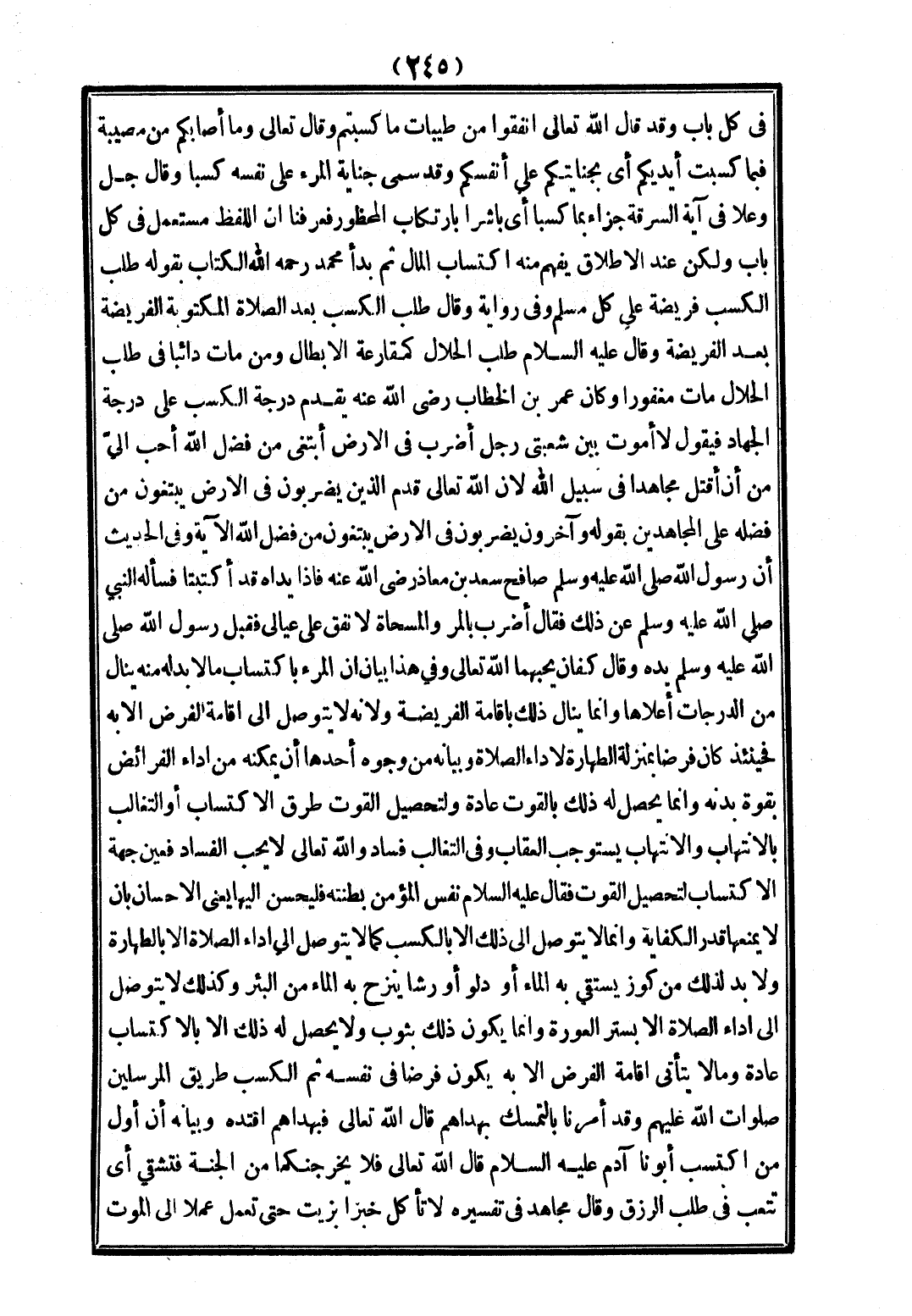 فِي كُلِّ بَابٍ، وَقَدْ قَالَ اللَّهُ تَعَالَى {أَنْفِقُوا مِنْ طَيِّبَاتِ مَا كَسَبْتُمْ} [البقرة: 267] وَقَالَ تَعَالَى {وَمَا أَصَابَكُمْ مِنْ مُصِيبَةٍ فَبِمَا كَسَبَتْ أَيْدِيكُمْ} [الشورى: 30] أَيْ بِجِنَايَتِكُمْ عَلَى أَنْفُسِكُمْ، وَقَدْ سَمَّى جِنَايَةَ الْمَرْءِ عَلَى نَفْسِهِ كَسْبًا وَقَالَ جَلَّ وَعَلَا فِي آيَةِ السَّرِقَةِ {جَزَاءً بِمَا كَسَبَا} [المائدة: 38] أَيْ بَاشَرَا بِارْتِكَابِ الْمَحْظُورِ فَعَرَفْنَا أَنَّ اللَّفْظَ مُسْتَعْمَلٌ فِي كُلِّ بَابٍ وَلَكِنْ عِنْدَ الْإِطْلَاقِ يُفْهَمُ مِنْهُ اكْتِسَابُ الْمَالِ ثُمَّ بَدَأَ مُحَمَّدٌ - رَحِمَهُ اللَّهُ - الْكِتَابَ بِقَوْلِهِ طَلَبُ الْكَسْبِ فَرِيضَةٌ عَلَى كُلِّ مُسْلِمٍ، وَفِي رِوَايَةٍ وَقَالَ: طَلَبُ الْكَسْبِ بَعْدَ الصَّلَاةِ الْمَكْتُوبَةِ الْفَرِيضَةُ بَعْدَ الْفَرِيضَةِ وَقَالَ - عَلَيْهِ السَّلَامُ - «طَلَبُ الْحَلَالِ كَمُقَارَعَةِ الْأَبْطَالِ، وَمَنْ مَاتَ دَائِبًا فِي طَلَبِ الْحَلَالِ مَاتَ مَغْفُورًا» وَكَانَ عُمَرُ بْنُ الْخَطَّابِ - رَضِيَ اللَّهُ عَنْهُ - يُقَدِّمُ دَرَجَةَ الْكَسْبِ عَلَى دَرَجَةِ الْجِهَادِ فَيَقُولُ لَأَنْ أَمُوتَ بَيْنَ شُعْبَتَيْ رَجُلٍ أَضْرِبُ فِي الْأَرْضِ ابْتَغَى مِنْ فَضْلِ اللَّهِ أَحَبُّ إلَيَّ مِنْ أَنْ أَقْتُلَ مُجَاهِدًا فِي سَبِيلِ اللَّهِ؛ لِأَنَّ اللَّهَ تَعَالَى قَدَّمَ الَّذِينَ يَضْرِبُونَ فِي الْأَرْضِ يَبْتَغُونَ مِنْ فَضْلِهِ عَلَى الْمُجَاهِدِينَ بِقَوْلِهِ {وَآخَرُونَ يَضْرِبُونَ فِي الْأَرْضِ يَبْتَغُونَ مِنْ فَضْلِ اللَّهِ} [المزمل: 20] الْآيَةَ، وَفِي الْحَدِيثِ «أَنَّ رَسُولَ اللَّهِ - صَلَّى اللَّهُ عَلَيْهِ وَسَلَّمَ - صَافَحَ سَعْدَ بْنَ مُعَاذٍ - رَضِيَ اللَّهُ عَنْهُ -، فَإِذَا يَدَاهُ قَدْ اكْتَبَتَا فَسَأَلَهُ النَّبِيُّ - صَلَّى اللَّهُ عَلَيْهِ وَسَلَّمَ - عَنْ ذَلِكَ فَقَالَ: أَضْرِبُ بِالْمَرِّ وَالْمِسْحَاةِ لِأُنْفِقَ عَلَى عِيَالِي فَقَبَّلَ رَسُولُ اللَّهِ - صَلَّى اللَّهُ عَلَيْهِ وَسَلَّمَ - يَدَهُ وَقَالَ كَفَّانِ يُحِبُّهُمَا اللَّهُ تَعَالَى».