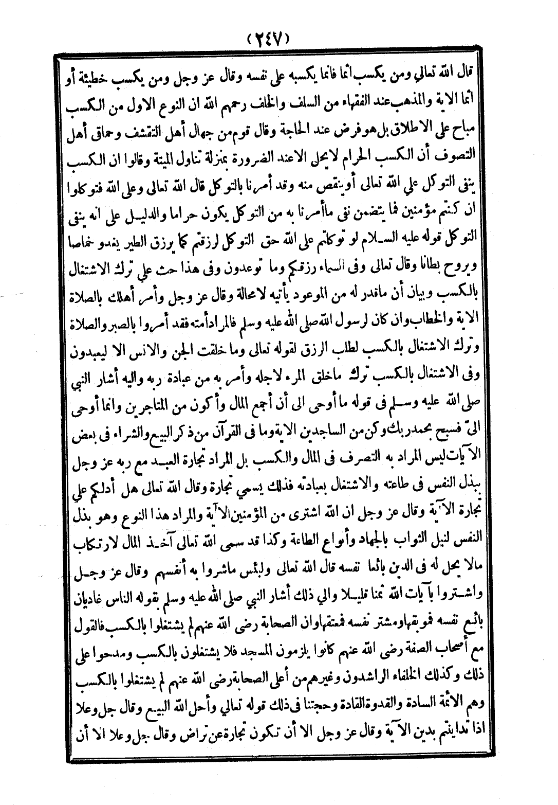 قَالَ اللَّهُ تَعَالَى {وَمَنْ يَكْسِبْ إثْمًا فَإِنَّمَا يَكْسِبُهُ عَلَى نَفْسِهِ} [النساء: 111] وَقَالَ عَزَّ وَجَلَّ {وَمَنْ يَكْسِبْ خَطِيئَةً أَوْ إثْمًا} [النساء: 112] الْآيَةَ، وَالْمَذْهَبُ عِنْدَ الْفُقَهَاءِ مِنْ السَّلَفِ وَالْخَلَفِ - رَحِمَهُمُ اللَّهُ - أَنَّ النَّوْعَ الْأَوَّلَ مِنْ الْكَسْبِ مُبَاحٌ عَلَى الْإِطْلَاقِ بَلْ هُوَ فَرْضٌ عِنْدَ الْحَاجَةِ وَقَالَ قَوْمٌ مِنْ جُهَّالِ أَهْلِ التَّقَشُّفِ وَحَمَاقَى أَهْلِ التَّصَوُّفِ: إنَّ الْكَسْبَ حَرَامٌ لَا يَحِلُّ إلَّا عِنْدَ الضَّرُورَةِ بِمَنْزِلَةِ تَنَاوُلِ الْمَيْتَةِ وَقَالُوا: إنَّ الْكَسْبَ يَنْفِي التَّوَكُّلَ عَلَى اللَّهِ تَعَالَى أَوْ يُنْقِصُ مِنْهُ، وَقَدْ أُمِرْنَا بِالتَّوَكُّلِ قَالَ اللَّهُ تَعَالَى {وَعَلَى اللَّهِ فَتَوَكَّلُوا إنْ كُنْتُمْ مُؤْمِنِينَ} [المائدة: 23] فَمَا يَتَضَمَّنُ نَفْيَ مَا أُمِرْنَا بِهِ مِنْ التَّوَكُّلِ يَكُونُ حَرَامًا، وَالدَّلِيلُ عَلَى أَنَّهُ يَنْفِي التَّوَكُّلَ قَوْلُهُ - عَلَيْهِ السَّلَامُ - «لَوْ تَوَكَّلْتُمْ عَلَى اللَّهِ حَقَّ التَّوَكُّلِ لَرُزِقْتُمْ، كَمَا يُرْزَقُ الطَّيْرُ يَغْدُو خِمَاصًا وَيَرُوحُ بِطَانًا» وَقَالَ تَعَالَى {وَفِي السَّمَاءِ رِزْقُكُمْ وَمَا تُوعَدُونَ} [الذاريات: 22]، وَفِي هَذَا حَثٌّ عَلَى تَرْكِ الِاشْتِغَالِ بِالْكَسْبِ وَبَيَانُ أَنَّ مَا قُدِّرَ لَهُ مِنْ الْمَوْعُودِ يَأْتِيهِ لَا مَحَالَةَ.