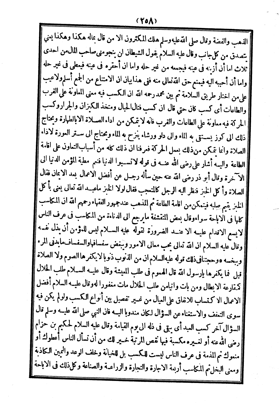 الذَّهَبِ وَالْفِضَّةِ وَقَالَ - صَلَّى اللَّهُ عَلَيْهِ وَسَلَّمَ - «هَلَكَ الْمُكْثِرُونَ إلَّا مَنْ قَالَ بِمَالِهِ هَكَذَا وَهَكَذَا» يَعْنِي يَتَصَدَّقُ مِنْ كُلِّ جَانِبٍ وَقَالَ - عَلَيْهِ السَّلَامُ - «يَقُولُ الشَّيْطَانُ: لَنْ يَنْجُوَ مِنِّي صَاحِبُ الْمَالِ مِنْ إحْدَى ثَلَاثٍ: إمَّا أَنْ أُزَيِّنَهُ فِي عَيْنِهِ فَيَجْمَعَهُ مِنْ غَيْرِ حِلِّهِ، وَإِمَّا أَنْ أُحَقِّرَهُ فِي عَيْنِهِ فَيُعْطِيَ فِي غَيْرِ حِلِّهِ، وَإِمَّا أَنْ أُحَبِّبَهُ إلَيْهِ فَيَمْنَعَ حَقَّ اللَّهِ تَعَالَى مِنْهُ» فَفِي هَذَا بَيَانُ أَنَّ الِامْتِنَاعَ مِنْ الْجَمْعِ أَسْلَمُ، وَلَا عَيْبَ عَلَى مَنْ اخْتَارَ طَرِيقَ السَّلَامَةِ ثُمَّ بَيَّنَ مُحَمَّدٌ - رَحِمَهُ اللَّهُ - أَنَّ الْكَسْبَ فِيهِ مَعْنَى الْمُعَاوَنَةِ عَلَى الْقُرَبِ وَالطَّاعَاتِ أَيَّ كَسْبٍ كَانَ حَتَّى قَالَ: إنَّ كَسْبَ فَتَّالِ الْحِبَالِ وَمُتَّخِذِ الْكِيزَانِ وَالْجِرَارِ وَكَسْبَ الْحَرَكَةِ فِيهِ مُعَاوَنَةٌ عَلَى الطَّاعَاتِ وَالْقُرَبِ، فَإِنَّهُ لَا يَتَمَكَّنُ مِنْ أَدَاءِ الصَّلَاةِ إلَّا بِالطَّهَارَةِ وَيَحْتَاجُ ذَلِكَ إلَى كُوزٍ يُسْتَقَى بِهِ الْمَاءُ وَإِلَى دَلْوٍ وَرِشَاءٍ يُنْزَحُ بِهِ الْمَاءُ وَيَحْتَاجُ إلَى سَتْرِ الْعَوْرَةِ لِأَدَاءِ الصَّلَاةِ، وَإِنَّمَا يَتَمَكَّنُ مِنْ ذَلِكَ بِعَمَلِ الْحَرَكَةِ فَعَرَفْنَا أَنَّ ذَلِكَ كُلَّهُ مِنْ أَسْبَابِ التَّعَاوُنِ عَلَى إقَامَةِ الطَّاعَةِ وَإِلَيْهِ أَشَارَ عَلِيٌّ - رَضِيَ اللَّهُ عَنْهُ - فِي قَوْلِهِ لَا تَسُبُّوا الدُّنْيَا فَنِعْمَ مَطِيَّةُ الْمُؤْمِنِ الدُّنْيَا إلَى الْآخِرَةِ، وَقَالَ أَبُو ذَرٍّ - رَضِيَ اللَّهُ عَنْهُ - حِينَ سَأَلَهُ رَجُلٌ عَنْ أَفْضَلِ الْأَعْمَالِ بَعْدَ الْإِيمَانِ فَقَالَ: الصَّلَاةُ وَأَكْلُ الْخُبْزِ فَنَظَرَ إلَيْهِ الرَّجُلُ كَالْمُتَعَجِّبِ فَقَالَ: لَوْلَا الْخُبْزُ مَا عُبِدَ اللَّهُ تَعَالَى يَعْنِي بِأَكْلِ الْخُبْزِ يُقِيمُ صُلْبَهُ فَيَتَمَكَّنُ مِنْ إقَامَةِ الطَّاعَةِ.