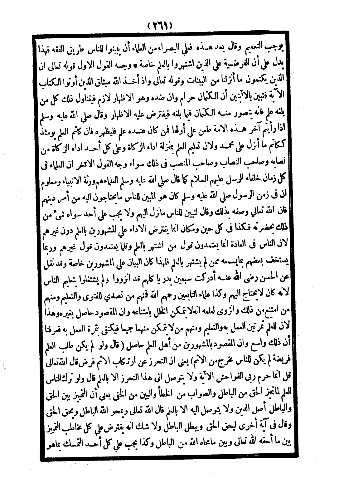 يُوجِبُ التَّعْمِيمَ وَقَالَ بَعْدَ هَذِهِ فَعَلَى الْبُصَرَاءِ مِنْ الْعُلَمَاءِ أَنْ يُبَيِّنُوا لِلنَّاسِ طَرِيقَ الْفِقْهِ فَهَذَا يَدُلُّ عَلَى أَنَّ الْفَرْضِيَّةَ عَلَى الَّذِينَ اشْتَهَرُوا بِالْعِلْمِ خَاصَّةً