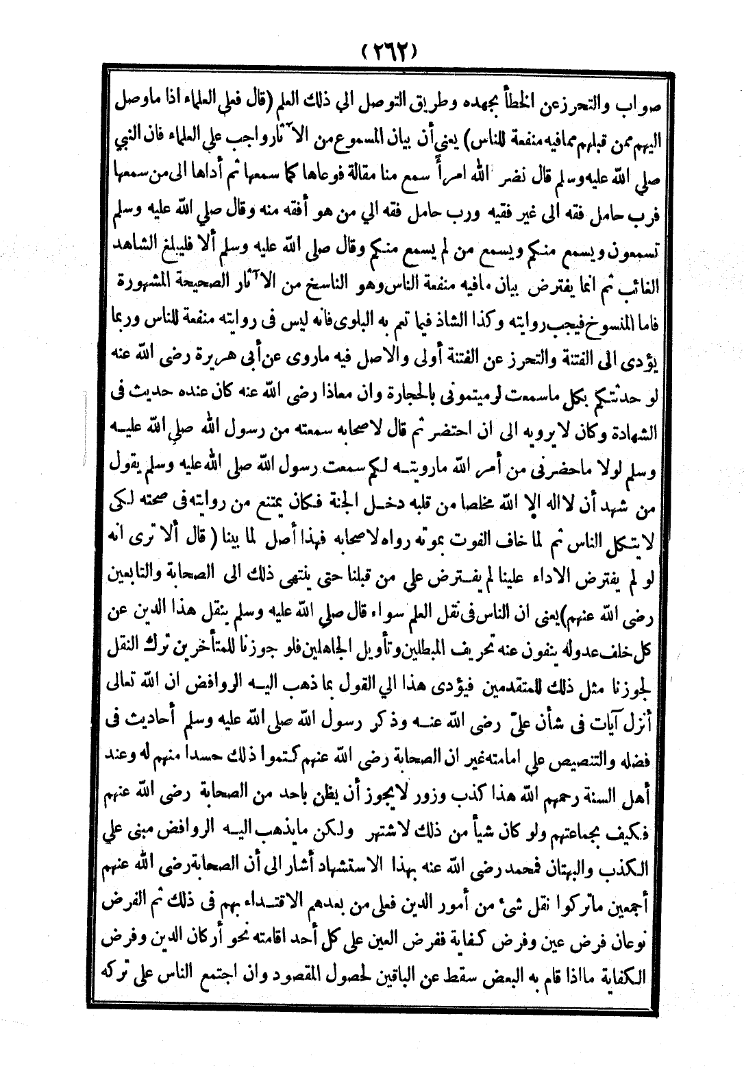 (قَالَ: أَلَا تَرَى أَنَّهُ لَوْ لَمْ يُفْتَرَضْ الْأَدَاءُ عَلَيْنَا لَمْ يُفْتَرَضْ عَلَى مَنْ قَبْلَنَا؟ حَتَّى يَنْتَهِيَ ذَلِكَ إلَى الصَّحَابَةِ وَالتَّابِعِينَ - رَضِيَ اللَّهُ عَنْهُمْ -) يَعْنِي أَنَّ النَّاسَ فِي نَقْلِ الْعِلْمِ سَوَاءٌ قَالَ - صَلَّى اللَّهُ عَلَيْهِ وَسَلَّمَ - «يَنْقُلُ هَذَا الدِّينَ عَنْ كُلِّ خَلَفٍ عُدُولُهُ يَنْفُونَ عَنْهُ تَحْرِيفَ الْمُبْطِلِينَ وَتَأْوِيلَ الْجَاهِلِينَ» فَلَوْ جَوَّزْنَا لِلْمُتَأَخِّرِينَ تَرْكَ النَّقْلِ لَجَوَّزْنَا مِثْلَ ذَلِكَ لِلْمُتَقَدِّمِينَ فَيُؤَدِّي هَذَا إلَى الْقَوْلِ بِمَا ذَهَبَ إلَيْهِ الرَّوَافِضُ أَنَّ اللَّهَ تَعَالَى أَنْزَلَ آيَاتٍ فِي شَأْنِ عَلِيٍّ - رَضِيَ اللَّهُ عَنْهُ - وَذَكَرَ رَسُولُ اللَّهِ - صَلَّى اللَّهُ عَلَيْهِ وَسَلَّمَ - أَحَادِيثَ فِي فَضْلِهِ وَالتَّنْصِيصَ عَلَى إمَامَتِهِ غَيْرَ أَنَّ الصَّحَابَةَ - رَضِيَ اللَّهُ عَنْهُمْ - كَتَمُوا ذَلِكَ حَسَدًا مِنْهُمْ لَهُ، وَعِنْدَ أَهْلِ السُّنَّةِ - رَحِمَهُمُ اللَّهُ - هَذَا كَذِبٌ وَزُورٌ لَا يَجُوزُ أَنْ يُظَنَّ بِأَحَدٍ مِنْ الصَّحَابَةِ - رَضِيَ اللَّهُ عَنْهُمْ - فَكَيْفَ بِجَمَاعَتِهِمْ وَلَوْ كَانَ شَيْئًا مِنْ ذَلِكَ لَاشْتَهَرَ وَلَكِنْ مَا يَذْهَبُ إلَيْهِ الرَّوَافِضُ مَبْنِيٌّ عَلَى الْكَذِبِ وَالْبُهْتَانِ فَمُحَمَّدٌ - رَضِيَ اللَّهُ عَنْهُ - بِهَذَا الِاسْتِشْهَادِ أَشَارَ إلَى أَنَّ الصَّحَابَةَ - رَضِيَ اللَّهُ عَنْهُمْ أَجْمَعِينَ - مَا تَرَكُوا نَقْلَ شَيْءٍ مِنْ أُمُورِ الدِّينِ فَعَلَى مَنْ بَعْدَهُمْ الِاقْتِدَاءُ بِهِمْ فِي ذَلِكَ ثُمَّ الْفَرْضُ نَوْعَانِ فَرْضُ عَيْنٍ وَفَرْضُ كِفَايَةٍ فَفَرْضُ الْعَيْنِ عَلَى كُلِّ أَحَدٍ إقَامَتُهُ نَحْوُ أَرْكَانِ الدِّينِ وَفَرْضُ الْكِفَايَةِ مَا إذَا قَامَ بِهِ الْبَعْضُ سَقَطَ عَنْ الْبَاقِينَ لِحُصُولِ الْمَقْصُودِ وَإِنْ اجْتَمَعَ النَّاسُ عَلَى تَرْكِهِ