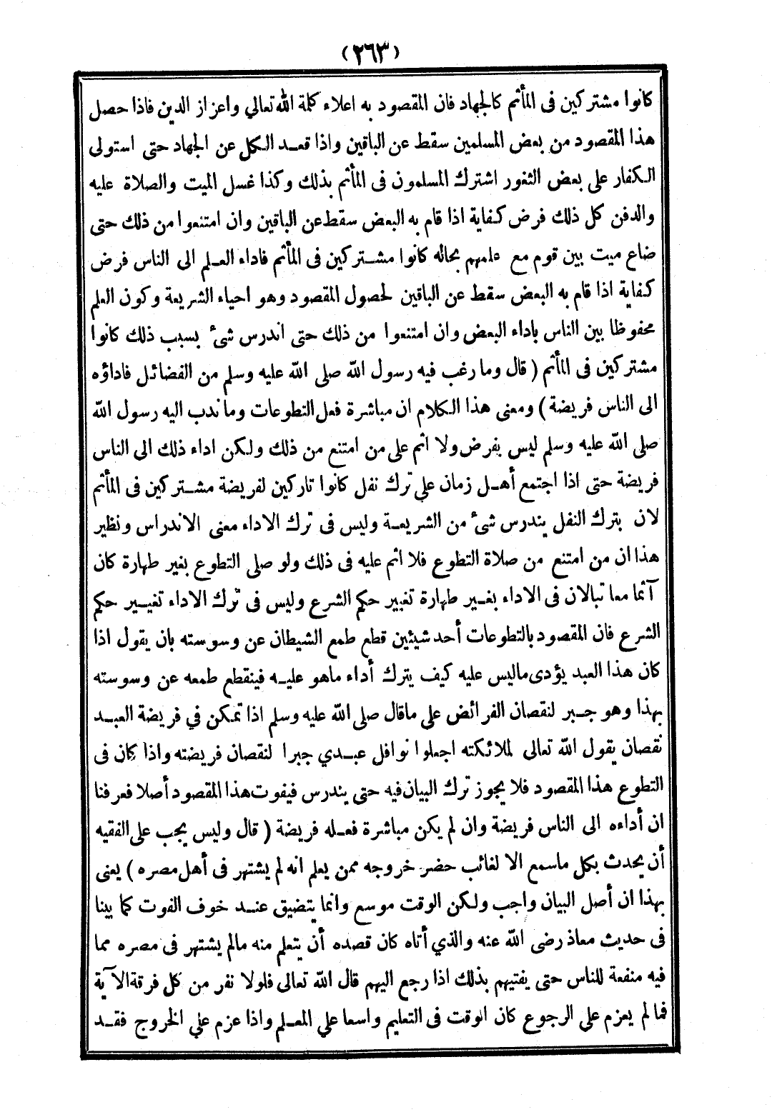 كَانُوا مُشْتَرَكِينَ فِي الْمَأْثَمِ كَالْجِهَادِ، فَإِنَّ الْمَقْصُودَ بِهِ إعْلَاءُ كَلِمَةِ اللَّهِ تَعَالَى وَإِعْزَازُ الدِّينِ، فَإِذَا حَصَلَ هَذَا الْمَقْصُودُ مِنْ بَعْضِ الْمُسْلِمِينَ سَقَطَ عَنْ الْبَاقِينَ، وَإِذَا قَعَدَ الْكُلُّ عَنْ الْجِهَادِ حَتَّى اسْتَوْلَى الْكُفَّارُ عَلَى بَعْضِ الثُّغُورِ اشْتَرَكَ الْمُسْلِمُونَ فِي الْمَأْثَمِ بِذَلِكَ وَكَذَا غُسْلُ الْمَيِّتِ وَالصَّلَاةُ عَلَيْهِ وَالدَّفْنُ كُلُّ ذَلِكَ فَرْضُ كِفَايَةٍ إذَا قَامَ بِهِ الْبَعْضُ سَقَطَ عَنْ الْبَاقِينَ، وَإِنْ امْتَنَعُوا مِنْ ذَلِكَ حَتَّى ضَاعَ مَيِّتٌ بَيْنَ قَوْمٍ مَعَ عِلْمِهِمْ بِحَالِهِ كَانُوا مُشْتَرَكِينَ فِي الْمَأْثَمِ فَأَدَاءُ الْعِلْمِ إلَى النَّاسِ فَرْضُ كِفَايَةٍ إذَا قَامَ بِهِ الْبَعْضُ سَقَطَ عَنْ الْبَاقِينَ لِحُصُولِ الْمَقْصُودِ، وَهُوَ إحْيَاءُ الشَّرِيعَةِ وَكَوْنُ الْعِلْمِ مَحْفُوظًا بَيْنَ النَّاسِ بِأَدَاءِ الْبَعْضِ، وَإِنْ امْتَنَعُوا مِنْ ذَلِكَ حَتَّى انْدَرَسَ شَيْءٌ بِسَبَبِ ذَلِكَ كَانُوا مُشْتَرَكِينَ فِي الْمَأْثَمِ