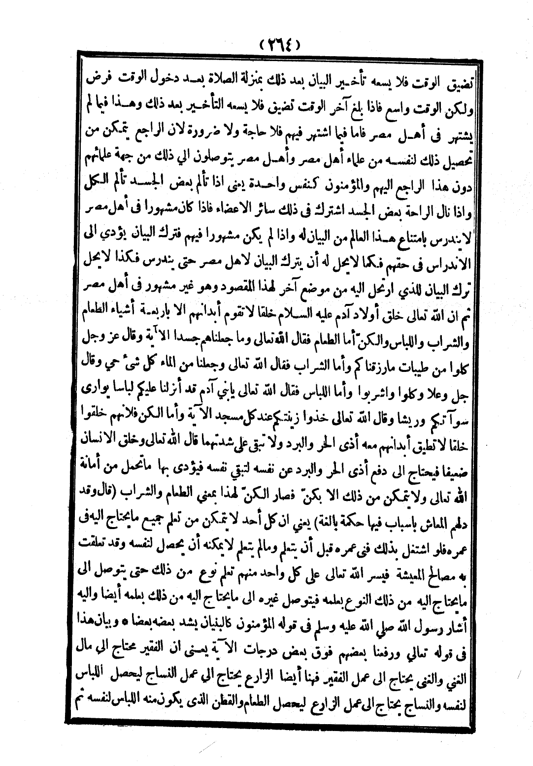 تَضَيَّقَ الْوَقْتُ فَلَا يَسَعُهُ تَأْخِيرُ الْبَيَانِ بَعْدَ ذَلِكَ بِمَنْزِلَةِ الصَّلَاةِ بَعْدَ دُخُولِ الْوَقْتِ فَرْضٌ، وَلَكِنَّ الْوَقْتَ وَاسِعٌ، فَإِذَا بَلَغَ آخِرَ الْوَقْتِ تَضَيَّقَ فَلَا يَسَعُهُ التَّأْخِيرُ بَعْدَ ذَلِكَ، وَهَذَا فِيمَا لَمْ يَشْتَهِرْ فِي أَهْلِ مِصْرٍ فَأَمَّا فِيمَا اشْتَهَرَ فِيهِمْ فَلَا حَاجَةَ وَلَا ضَرُورَةَ؛ لِأَنَّ الرَّاجِعَ يَتَمَكَّنُ مِنْ تَحْصِيلِ ذَلِكَ لِنَفْسِهِ مِنْ عُلَمَاءِ أَهْلِ مِصْرٍ، وَأَهْلُ مِصْرٍ يَتَوَصَّلُونَ إلَى ذَلِكَ مِنْ جِهَةِ عُلَمَائِهِمْ دُونَ هَذَا الرَّاجِعِ إلَيْهِمْ وَالْمُؤْمِنُونَ كَنَفْسٍ وَاحِدَةٍ يَعْنِي إذَا تَأَلَّمَ بَعْضُ الْجَسَدِ تَأَلَّمَ الْكُلُّ، وَإِذَا نَالَ الرَّاحَةَ بَعْضُ الْجَسَدِ اشْتَرَكَ فِي ذَلِكَ الْأَعْضَاءُ، فَإِذَا كَانَ مَشْهُورًا فِي أَهْلِ مِصْرٍ لَا يَنْدَرِسُ بِامْتِنَاعِ هَذَا الْعَالِمِ مِنْ الْبَيَانِ لَهُ، وَإِذَا لَمْ يَكُنْ مَشْهُورًا فِيهِمْ فَتَرْكُ الْبَيَانِ يُؤَدِّي إلَى الِانْدِرَاسِ فِي حَقِّهِمْ فَكَمَا لَا يَحِلُّ لَهُ أَنْ يَتْرُكَ الْبَيَانَ لِأَهْلِ مِصْرٍ حَتَّى يَنْدَرِسَ فَكَذَا لَا يَحِلُّ تَرْكُ الْبَيَانِ لِلَّذِي ارْتَحَلَ إلَيْهِ مِنْ مَوْضِعٍ آخَرَ لِهَذَا الْمَقْصُودِ، وَهُوَ غَيْرُ مَشْهُورٍ فِي أَهْلِ مِصْرٍ ثُمَّ إنَّ اللَّهَ تَعَالَى خَلَقَ أَوْلَادَ آدَمَ - عَلَيْهِ السَّلَامُ - خَلْقًا لَا تَقُومُ أَبْدَانُهُمْ إلَّا بِأَرْبَعَةِ أَشْيَاءَ الطَّعَامُ وَالشَّرَابُ وَاللِّبَاسُ وَالْكِنُّ، أَمَّا الطَّعَامُ فَقَالَ اللَّهُ تَعَالَى {وَمَا جَعَلْنَاهُمْ جَسَدًا} [الأنبياء: 8] الْآيَةَ وَقَالَ عَزَّ وَجَلَّ {كُلُوا مِنْ طَيِّبَاتِ مَا رَزَقْنَاكُمْ} [البقرة: 57]، وَأَمَّا الشَّرَابُ فَقَالَ اللَّهُ تَعَالَى {وَجَعَلْنَا مِنْ الْمَاءِ كُلَّ شَيْءٍ حَيٍّ} [الأنبياء: 30] وَقَالَ جَلَّ وَعَلَا {وَكُلُوا وَاشْرَبُوا} [البقرة: 187]، وَأَمَّا اللِّبَاسُ فَقَالَ اللَّهُ تَعَالَى {يَا بَنِي آدَمَ قَدْ أَنْزَلْنَا عَلَيْكُمْ لِبَاسًا يُوَارِي سَوْآتِكُمْ وَرِيشًا} [الأعراف: 26] وَقَالَ اللَّهُ تَعَالَى {خُذُوا زِينَتَكُمْ عِنْدَ كُلِّ مَسْجِدٍ} [الأعراف: 31] الْآيَةَ، وَأَمَّا الْكِنُّ فَلِأَنَّهُمْ خُلِقُوا خَلْقًا لَا تُطِيقُ أَبْدَانُهُمْ مَعَهُ أَذَى الْحَرِّ وَالْبَرْدِ، وَلَا تَبْقَى عَلَى شِدَّتِهِمَا قَالَ اللَّهُ تَعَالَى {وَخُلِقَ الْإِنْسَانُ ضَعِيفًا} [النساء: 28] فَيَحْتَاجُ إلَى دَفْعِ أَذَى الْحَرِّ وَالْبَرْدِ عَنْ نَفْسِهِ لِتَبْقَى نَفْسُهُ فَيُؤَدِّي بِهَا مَا تَحَمَّلَ مِنْ أَمَانَةِ اللَّهِ تَعَالَى، وَلَا يَتَمَكَّنُ مِنْ ذَلِكَ إلَّا بِكِنٍّ فَصَارَ الْكِنُّ لِهَذَا بِمَعْنَى الطَّعَامِ وَالشَّرَابِ