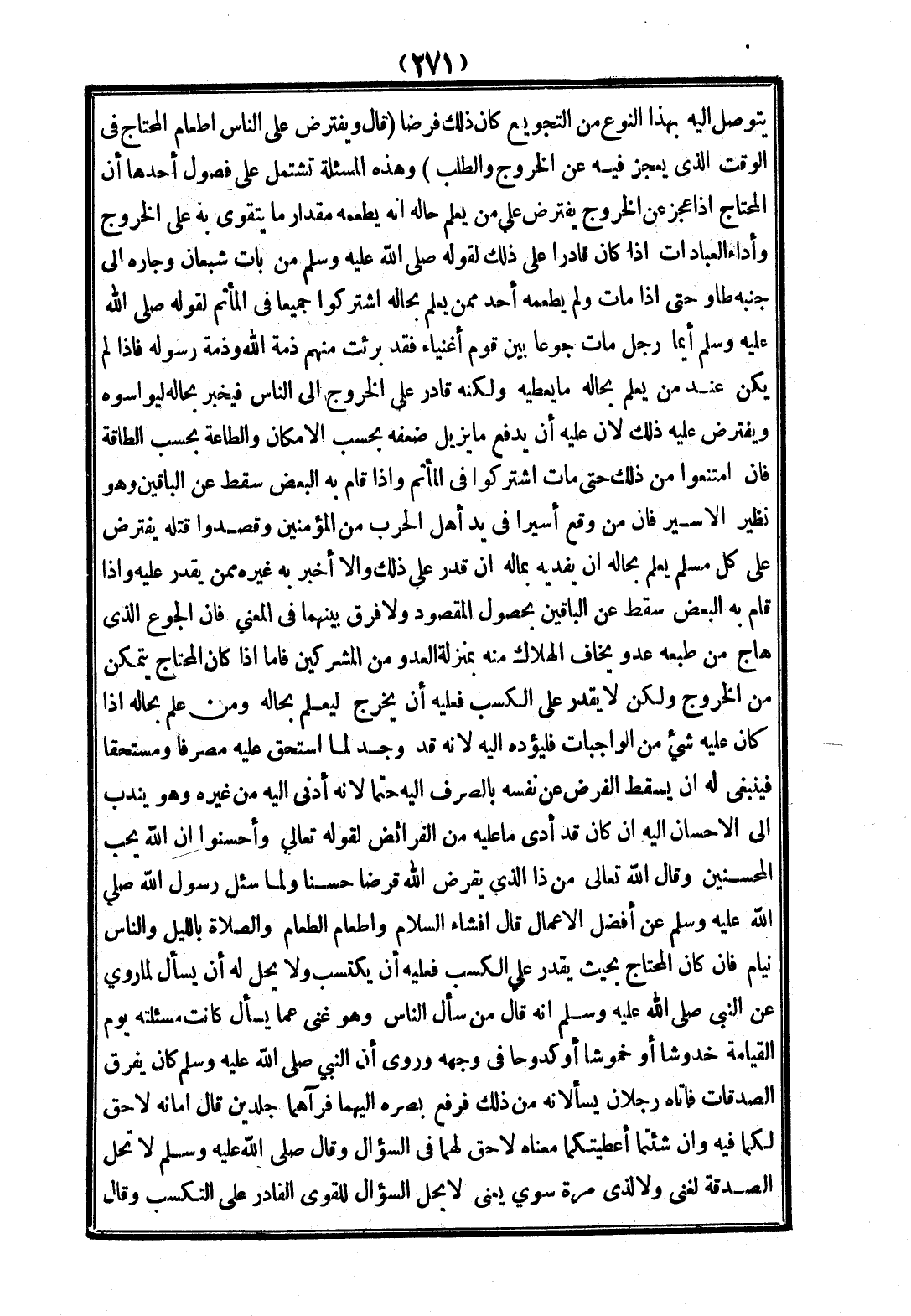 أَحَدُهَا: أَنَّ الْمُحْتَاجَ إذَا عَجَزَ عَنْ الْخُرُوجِ يُفْتَرَضُ عَلَى مَنْ يَعْلَمُ أَنَّهُ يُطْعِمُهُ مِقْدَارَ مَا يَتَقَوَّى بِهِ عَلَى الْخُرُوجِ وَأَدَاءِ الْعِبَادَاتِ إذَا كَانَ قَادِرًا عَلَى ذَلِكَ لِقَوْلِهِ - صَلَّى اللَّهُ عَلَيْهِ وَسَلَّمَ - مَنْ بَاتَ شَبْعَانَ وَجَارُهُ إلَى جَنْبِهِ طَاوٍ حَتَّى إذَا مَاتَ، وَلَمْ يُطْعِمْهُ أَحَدٌ مِمَّنْ يَعْلَمُ بِحَالِهِ اشْتَرَكُوا جَمِيعًا فِي الْمَأْثَمِ لِقَوْلِهِ - صَلَّى اللَّهُ عَلَيْهِ وَسَلَّمَ - «أَيُّمَا رَجُلٍ مَاتَ جُوعًا بَيْنَ قَوْمٍ أَغْنِيَاءٍ، فَقَدْ بَرِئَتْ مِنْهُمْ ذِمَّةُ اللَّهِ وَذِمَّةُ رَسُولِهِ»، فَإِذَا لَمْ يَكُنْ عِنْدَ مَنْ يَعْلَمُ بِحَالِهِ مَا يُعْطِيهِ، وَلَكِنَّهُ قَادِرٌ عَلَى الْخُرُوجِ إلَى النَّاسِ فَيُخْبِرُ بِحَالِهِ لِيُوَاسُوهُ وَيُفْتَرَضُ عَلَيْهِ ذَلِكَ؛ لِأَنَّ عَلَيْهِ أَنْ يَدْفَعَ مَا يُزِيلُ ضَعْفَهُ بِحَسَبِ الْإِمْكَانِ وَالطَّاعَةُ بِحَسَبِ الطَّاقَةِ فَإِنْ امْتَنَعُوا مِنْ ذَلِكَ حَتَّى مَاتَ اشْتَرَكُوا فِي الْمَأْثَمِ، وَإِذَا قَامَ بِهِ الْبَعْضُ سَقَطَ عَنْ الْبَاقِينَ، وَهُوَ نَظِيرُ الْأَسِيرِ، فَإِنَّ مَنْ وَقَعَ أَسِيرًا فِي يَدِ أَهْلِ الْحَرْبِ مِنْ الْمُؤْمِنِينَ وَقَصَدُوا قَتْلَهُ يُفْتَرَضُ عَلَى كُلِّ مُسْلِمٍ يَعْلَمُ بِحَالِهِ أَنْ يَفْدِيَهُ بِمَالِهِ إنْ قَدَرَ عَلَى ذَلِكَ وَإِلَّا أَخْبَرَ بِهِ غَيْرَهُ مِمَّنْ يَقْدِرُ عَلَيْهِ، وَإِذَا قَامَ بِهِ الْبَعْضُ سَقَطَ عَنْ الْبَاقِينَ بِحُصُولِ الْمَقْصُودِ، وَلَا فَرْقَ بَيْنَهُمَا فِي الْمَعْنَى، فَإِنَّ الْجُوعَ الَّذِي هَاجَ مِنْ طَبْعِهِ عَدُوٌّ يُخَافُ الْهَلَاكُ مِنْهُ بِمَنْزِلَةِ الْعَدُوِّ مِنْ الْمُشْرِكِينَ.