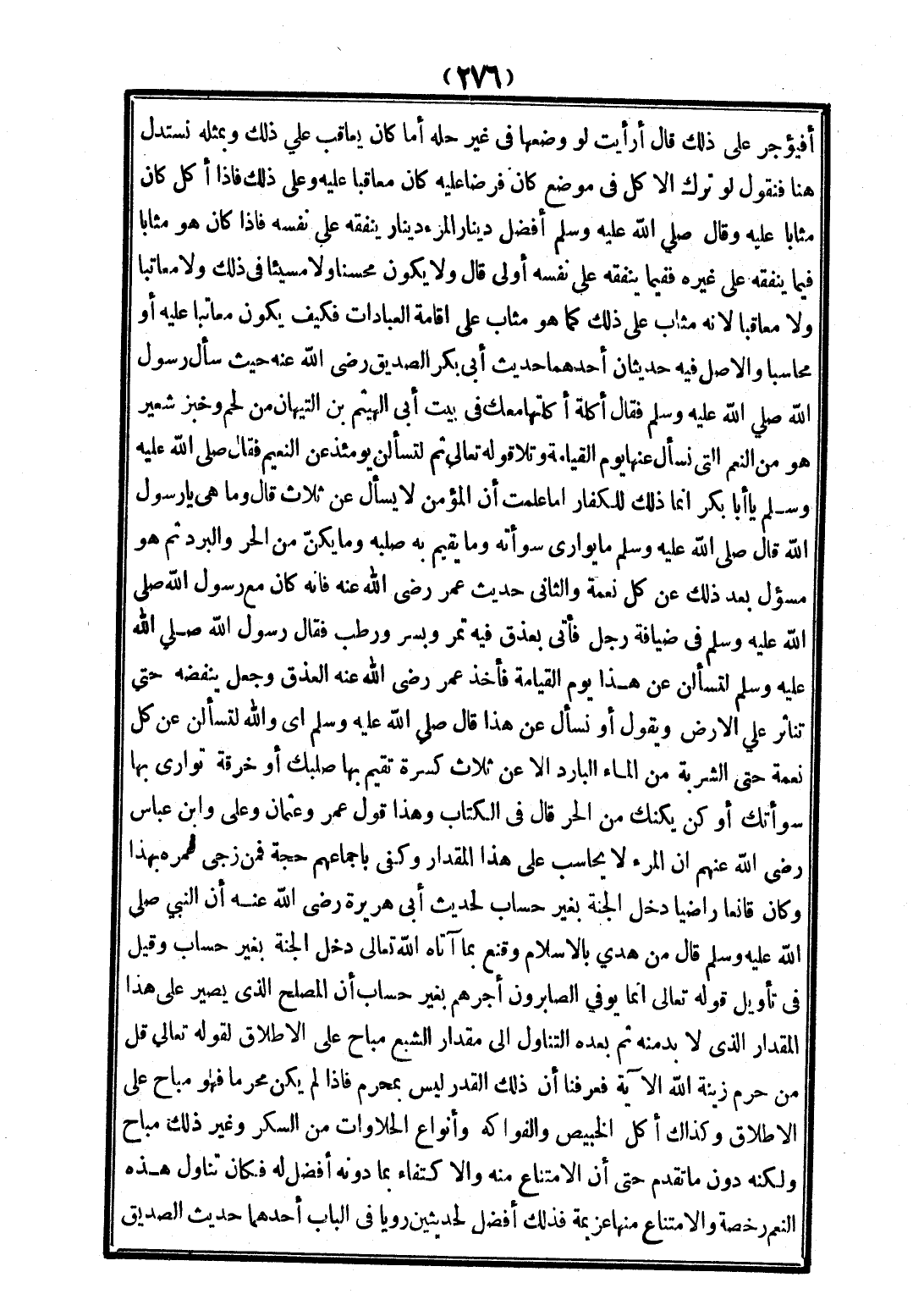 وَالثَّانِي حَدِيثُ «عُمَرَ - رَضِيَ اللَّهُ عَنْهُ -، فَإِنَّهُ كَانَ مَعَ رَسُولِ اللَّهِ - صَلَّى اللَّهُ عَلَيْهِ وَسَلَّمَ - فِي ضِيَافَةِ رَجُلٍ فَأُتِيَ بِعِذْقٍ فِيهِ تَمْرٌ وَبُسْرٌ وَرُطَبٌ فَقَالَ رَسُولُ اللَّهِ - صَلَّى اللَّهُ عَلَيْهِ وَسَلَّمَ - لَتُسْأَلُنَّ عَنْ هَذَا يَوْمَ الْقِيَامَةِ فَأَخَذَ عُمَرُ - رَضِيَ اللَّهُ عَنْهُ - الْعِذْقَ وَجَعَلَ يَنْفُضُهُ حَتَّى تَنَاثَرَ عَلَى الْأَرْضِ وَيَقُولُ: أَوَنُسْأَلُ عَنْ هَذَا: قَالَ - صَلَّى اللَّهُ عَلَيْهِ وَسَلَّمَ - إي وَاَللَّهِ لَتُسْأَلُنَّ عَنْ كُلِّ نِعْمَةٍ حَتَّى الشَّرْبَةَ مِنْ الْمَاءِ الْبَارِدِ إلَّا عَنْ ثَلَاثٍ كِسْرَةٌ تُقِيمُ بِهَا صُلْبَك أَوْ خِرْقَةٌ تُوَارِي بِهَا سَوْأَتَك أَوْ كِنٌّ يُكِنُّك مِنْ الْحَرِّ» قَالَ فِي الْكِتَابِ، وَهَذَا قَوْلُ عُمَرَ وَعُثْمَانَ وَعَلِيٍّ وَابْنِ عَبَّاسٍ - رَضِيَ اللَّهُ عَنْهُمْ - أَنَّ الْمَرْءَ لَا يُحَاسَبُ عَلَى هَذَا الْمِقْدَارِ وَكَفَى بِإِجْمَاعِهِمْ حُجَّةً فَمَنْ زَجَّى عُمْرَهُ بِهَذَا وَكَانَ قَانِعًا رَاضِيًا دَخَلَ الْجَنَّةَ بِغَيْرِ حِسَابٍ لِحَدِيثِ أَبِي هُرَيْرَةَ - رَضِيَ اللَّهُ عَنْهُ - أَنَّ النَّبِيَّ - صَلَّى اللَّهُ عَلَيْهِ وَسَلَّمَ - قَالَ «مَنْ هُدِيَ بِالْإِسْلَامِ وَقَنَعَ بِمَا آتَاهُ اللَّهُ تَعَالَى دَخَلَ الْجَنَّةَ بِغَيْرِ حِسَابٍ» وَقِيلَ فِي تَأْوِيلِ قَوْله تَعَالَى {إنَّمَا يُوَفَّى الصَّابِرُونَ أَجْرَهُمْ بِغَيْرِ حِسَابٍ} [الزمر: 10] أَنَّ الْمُصْلِحَ الَّذِي يَصِيرُ عَلَى هَذَا الْمِقْدَارِ الَّذِي لَا بُدَّ مِنْهُ ثُمَّ بَعْدَهُ التَّنَاوُلُ إلَى مِقْدَارِ الشِّبَعِ مُبَاحٌ عَلَى الْإِطْلَاقِ لِقَوْلِهِ تَعَالَى {قُلْ مَنْ حَرَّمَ زِينَةَ اللَّهِ} [الأعراف: 32] الْآيَةَ فَعَرَفْنَا أَنَّ ذَلِكَ الْقَدْرَ لَيْسَ بِمُحَرَّمٍ، فَإِذَا لَمْ يَكُنْ مُحَرَّمًا، فَهُوَ مُبَاحٌ عَلَى الْإِطْلَاقِ، وَكَذَلِكَ أَكْلُ الْخَبِيصِ وَالْفَوَاكِهِ وَأَنْوَاعِ الْحَلَاوَاتِ مِنْ السُّكَّرِ وَغَيْرِ ذَلِكَ مُبَاحٌ، وَلَكِنَّهُ دُونَ مَا تَقَدَّمَ حَتَّى إنَّ الِامْتِنَاعَ مِنْهُ وَالِاكْتِفَاءَ بِمَا دُونَهُ أَفْضَلُ لَهُ فَكَانَ تَنَاوُلُ هَذِهِ النِّعَمِ رُخْصَةً وَالِامْتِنَاعُ مِنْهَا عَزِيمَةً فَذَلِكَ أَفْضَلُ لِحَدِيثَيْنِ رُوِيَا فِي الْبَابِ أَحَدُهُمَا حَدِيثُ الصِّدِّيقِ