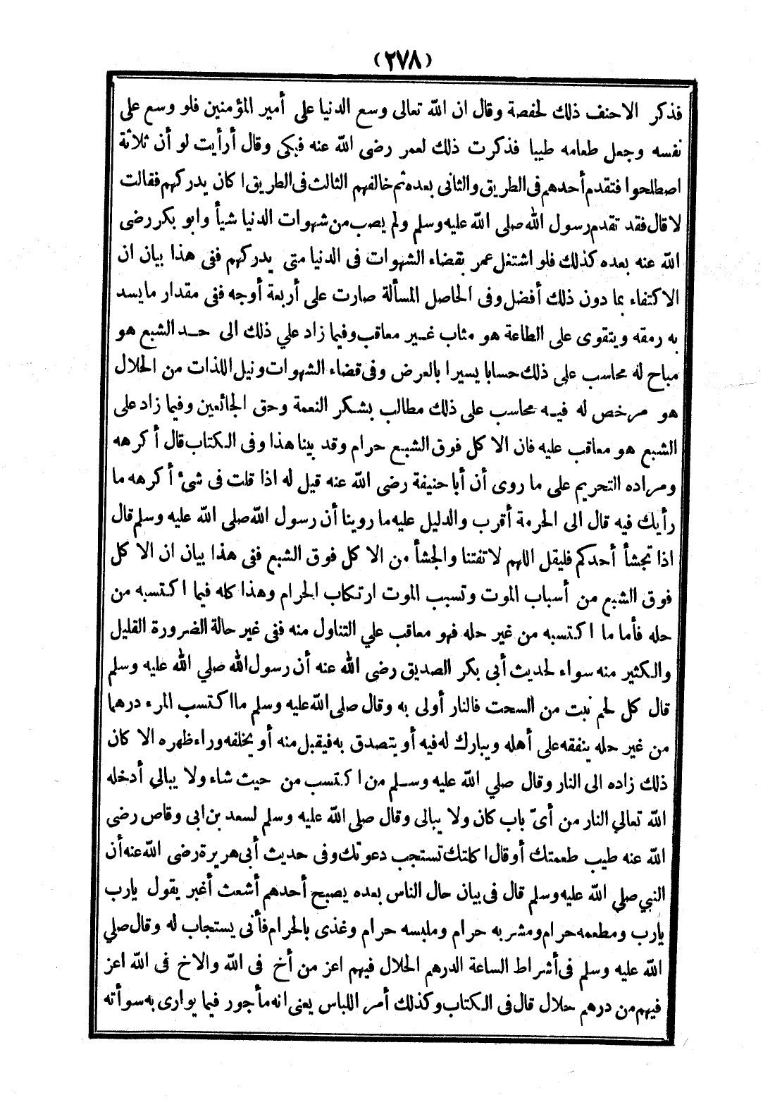 فَذَكَرَ الْأَحْنَفُ ذَلِكَ لِحَفْصَةَ وَقَالَ: إنَّ اللَّهَ تَعَالَى وَسَّعَ الدُّنْيَا عَلَى أَمِيرِ الْمُؤْمِنِينَ، فَلَوْ وَسَّعَ عَلَى نَفْسِهِ وَجَعَلَ طَعَامَهُ طَيِّبًا فَذَكَرْتُ ذَلِكَ لِعُمَرَ - رَضِيَ اللَّهُ عَنْهُ - فَبَكَى وَقَالَ أَرَأَيْت لَوْ أَنَّ ثَلَاثَةً اصْطَلَحُوا فَتَقَدَّمَ أَحَدُهُمْ فِي الطَّرِيقِ وَالثَّانِي بَعْدَهُ ثُمَّ خَالَفَهُمْ الثَّالِثُ فِي الطَّرِيقِ أَكَانَ يُدْرِكُهُمْ؟ فَقَالَتْ: لَا، قَالَ: فَقَدْ تَقَدَّمَ رَسُولُ اللَّهِ - صَلَّى اللَّهُ عَلَيْهِ وَسَلَّمَ -، وَلَمْ يُصِبْ مِنْ شَهَوَاتِ الدُّنْيَا شَيْئًا وَأَبُو بَكْرٍ - رَضِيَ اللَّهُ عَنْهُ - بَعْدَهُ كَذَلِكَ، فَلَوْ اشْتَغَلَ عُمَرُ بِقَضَاءِ الشَّهَوَاتِ فِي الدُّنْيَا مَتَى يُدْرِكُهُمْ» فَفِي هَذَا بَيَانُ أَنَّ الِاكْتِفَاءَ بِمَا دُونَ ذَلِكَ أَفْضَلُ، وَفِي الْحَاصِلِ الْمَسْأَلَةُ صَارَتْ عَلَى أَرْبَعَةِ أَوْجُهٍ فَفِي مِقْدَارِ مَا يَسُدُّ بِهِ رَمَقَهُ وَيَتَقَوَّى عَلَى الطَّاعَةِ هُوَ مُثَابٌ غَيْرُ مُعَاقَبٍ، وَفِيمَا زَادَ عَلَى ذَلِكَ إلَى حَدِّ الشِّبَعِ هُوَ مُبَاحٌ لَهُ مُحَاسَبٌ عَلَى ذَلِكَ حِسَابًا يَسِيرًا بِالْعَرَضِ.