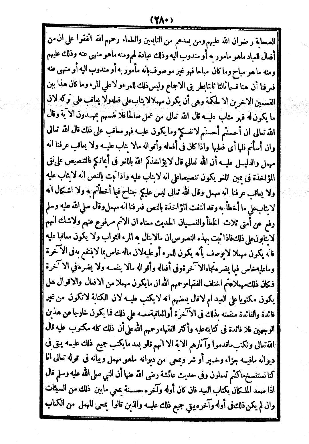 الصَّحَابَةَ - رِضْوَانُ اللَّهِ عَلَيْهِمْ -، وَمَنْ بَعْدَهُمْ مِنْ التَّابِعِينَ وَالْعُلَمَاءِ - رَحِمَهُمُ اللَّهُ - اتَّفَقُوا عَلَى أَنَّ مِنْ أَفْعَالِ الْعِبَادِ مَا هُوَ مَأْمُورٌ بِهِ أَوْ مَنْدُوبٌ إلَيْهِ، وَذَلِكَ عِبَادَةٌ لَهُمْ، وَمِنْهُ مَا هُوَ مَنْهِيٌّ عَنْهُ، وَذَلِكَ عَلَيْهِمْ، وَمِنْهُ مَا هُوَ مُبَاحٌ وَمَا كَانَ مُبَاحًا، فَهُوَ غَيْرُ مَوْصُوفٍ بِأَنَّهُ مَأْمُورٌ بِهِ أَوْ مَنْدُوبٌ إلَيْهِ أَوْ مَنْهِيٌّ عَنْهُ فَعَرَفْنَا أَنَّ هُنَا قِسْمًا ثَالِثًا ثَابِتًا بِطَرِيقِ الْإِجْمَاعِ وَلَيْسَ ذَلِكَ لِلْمَرْءِ، وَلَا عَلَى الْمَرْءِ وَمَا كَانَ هَذَا بَيْنَ الْقِسْمَيْنِ الْآخَرَيْنِ إلَّا لِحِكْمَةٍ وَهِيَ أَنْ يَكُونَ مُهْمَلًا لَا يُثَابُ عَلَى فِعْلِهِ وَلَا يُعَاقَبُ عَلَى تَرْكِهِ؛ لِأَنَّ مَا يَكُونُ لَهُ، فَهُوَ مُثَابٌ عَلَيْهِ قَالَ اللَّهُ تَعَالَى {وَمَنْ عَمِلَ صَالِحًا فَلِأَنْفُسِهِمْ يَمْهَدُونَ} [الروم: 44] الْآيَةَ وَقَالَ اللَّهُ تَعَالَى {إنْ أَحْسَنْتُمْ أَحْسَنْتُمْ لِأَنْفُسِكُمْ} [الإسراء: 7] وَمَا يَكُونُ عَلَيْهِ، فَهُوَ مُعَاقَبٌ عَلَى ذَلِكَ قَالَ اللَّهُ تَعَالَى {وَإِنْ أَسَأْتُمْ فَلَهَا} [الإسراء: 7] أَيْ فَعَلَيْهَا وَإِذَا كَانَ فِي أَفْعَالِهِ وَأَقْوَالِهِ مَا لَا يُثَابُ عَلَيْهِ وَلَا يُعَاقَبُ عَرَفْنَا أَنَّهُ مُهْمَلٌ وَالدَّلِيلُ عَلَيْهِ أَنَّ اللَّهَ تَعَالَى قَالَ {لَا يُؤَاخِذُكُمْ اللَّهُ بِاللَّغْوِ فِي أَيْمَانِكُمْ} [البقرة: 225].