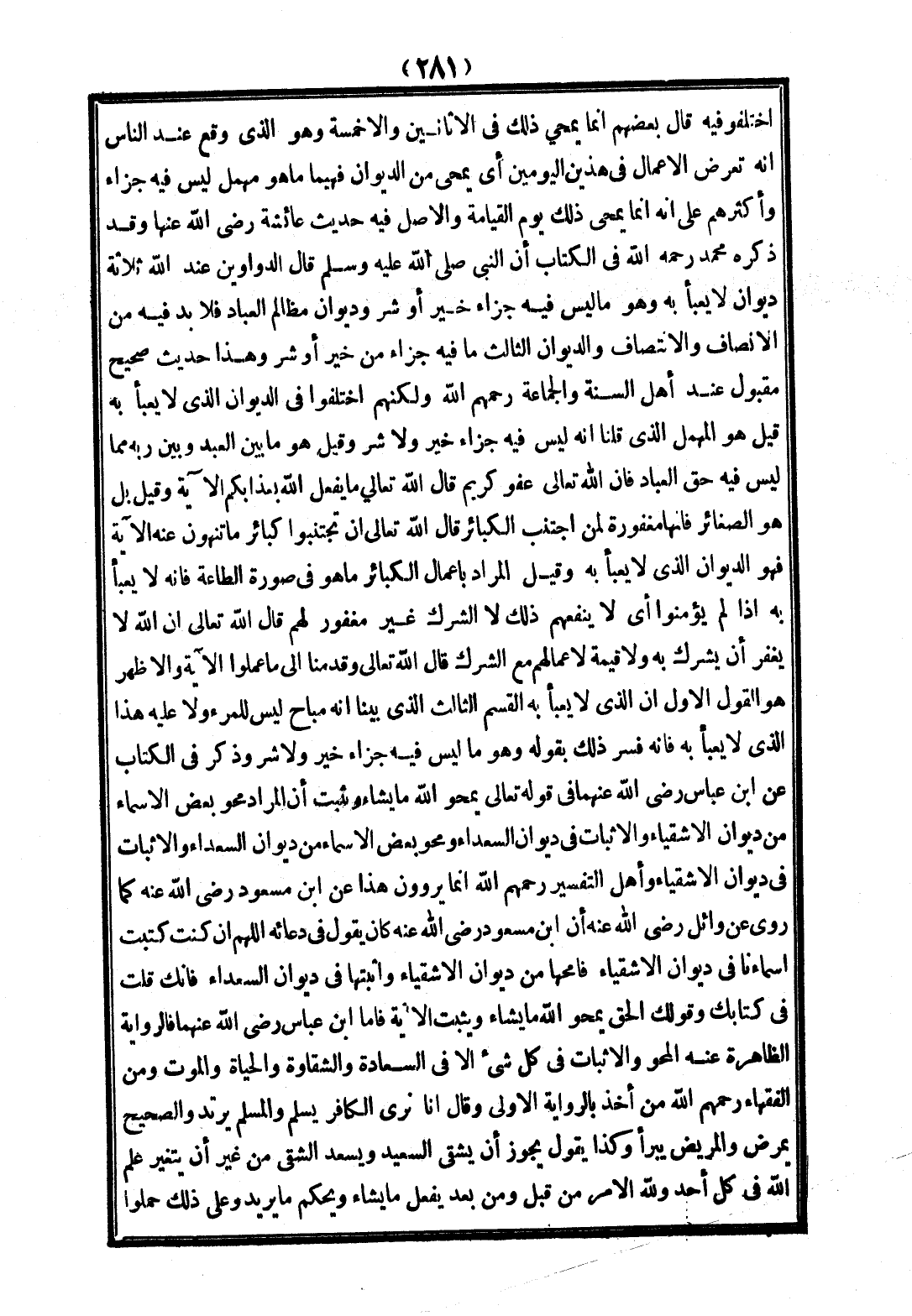 الْقِسْمَ الثَّالِثَ الَّذِي بَيَّنَّا أَنَّهُ مُبَاحٌ لَيْسَ لِلْمَرْءِ، وَلَا عَلَيْهِ هَذَا الَّذِي لَا يَعْبَأُ بِهِ، فَإِنَّهُ فَسَّرَ ذَلِكَ بِقَوْلِهِ، وَهُوَ مَا لَيْسَ فِيهِ جَزَاءُ خَيْرٍ، وَلَا شَرٍّ وَذُكِرَ فِي الْكِتَابِ عَنْ ابْنِ عَبَّاسٍ - رَضِيَ اللَّهُ عَنْهُمَا - فِي قَوْله تَعَالَى {يَمْحُوا اللَّهُ مَا يَشَاءُ وَيُثْبِتُ} [الرعد: 39] أَنَّ الْمُرَادَ مَحْوُ بَعْضِ الْأَسْمَاءِ مِنْ دِيوَانِ الْأَشْقِيَاءِ وَالْإِثْبَاتُ فِي دِيوَانِ السُّعَدَاءِ، وَمَحْوُ بَعْضِ الْأَسْمَاءِ مِنْ دِيوَانِ السُّعَدَاءِ وَالْإِثْبَاتُ فِي دِيوَانِ الْأَشْقِيَاءِ وَأَهْلُ التَّفْسِيرِ - رَحِمَهُمُ اللَّهُ - إنَّمَا يَرْوُونَ هَذَا عَنْ ابْنِ مَسْعُودٍ - رَضِيَ اللَّهُ عَنْهُ -، كَمَا رُوِيَ عَنْ وَائِلٍ - رَضِيَ اللَّهُ عَنْهُ - أَنَّ ابْنَ مَسْعُودٍ - رَضِيَ اللَّهُ عَنْهُ - كَانَ يَقُولُ فِي دُعَائِهِ: اللَّهُمَّ إنْ كُنْت كَتَبْت أَسْمَاءَنَا فِي دِيوَانِ الْأَشْقِيَاءِ فَامْحُهَا مِنْ دِيوَانِ الْأَشْقِيَاءِ وَأَثْبِتْهَا فِي دِيوَانِ السُّعَدَاءِ، فَإِنَّك قُلْت فِي كِتَابِك وَقَوْلُك الْحَقُّ {يَمْحُوا اللَّهُ مَا يَشَاءُ وَيُثْبِتُ} [الرعد: 39] الْآيَةَ فَأَمَّا ابْنُ عَبَّاسٍ - رَضِيَ اللَّهُ عَنْهُمَا - فَالرِّوَايَةُ الظَّاهِرَةُ عَنْهُ الْمَحْوُ وَالْإِثْبَاتُ فِي كُلِّ شَيْءٍ إلَّا فِي السَّعَادَةِ وَالشَّقَاوَةِ وَالْحَيَاةِ وَالْمَوْتِ، وَمِنْ الْفُقَهَاءِ - رَحِمَهُمُ اللَّهُ - مَنْ أَخَذَ بِالرِّوَايَةِ الْأُولَى وَقَالَ إنَّا نَرَى الْكَافِرَ يُسْلِمُ وَالْمُسْلِمَ يَرْتَدُّ وَالصَّحِيحَ يَمْرَضُ وَالْمَرِيضَ يَبْرَأُ، وَكَذَا نَقُولُ يَجُوزُ أَنْ يَشْقَى السَّعِيدُ وَيَسْعَدَ الشَّقِيُّ مِنْ غَيْرِ أَنْ يَتَغَيَّرَ عِلْمُ اللَّهِ فِي كُلِّ أَحَدٍ وَلِلَّهِ الْأَمْرُ مِنْ قَبْلُ، وَمِنْ بَعْدُ يَفْعَلُ مَا يَشَاءُ وَيَحْكُمُ مَا يُرِيدُ وَعَلَى ذَلِكَ حَمَلُوا