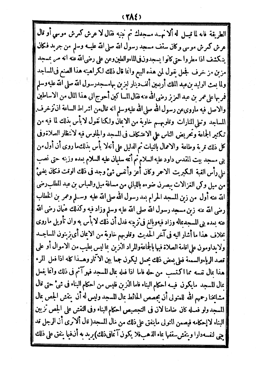 الطَّرِيقَةِ، فَإِنَّهُ «لَمَّا قِيلَ لَهُ: أَلَا نَهُدُّ مَسْجِدَك ثُمَّ نَبْنِيهِ فَقَالَ: لَا عَرْشَ كَعَرْشِ مُوسَى أَوْ قَالَ عَرْشٌ كَعَرْشِ مُوسَى وَكَانَ سَقْفُ مَسْجِدِ رَسُولِ اللَّهِ - صَلَّى اللَّهُ عَلَيْهِ وَسَلَّمَ - مِنْ جَرِيدٍ فَكَانَ يَنْكَشِفُ إذَا مُطِرُوا حَتَّى كَانُوا يَسْجُدُونَ فِي الْمَاءِ وَالطِّينِ» وَعَنْ عَلِيٍّ - رَضِيَ اللَّهُ عَنْهُ - أَنَّهُ مَرَّ بِمَسْجِدٍ مُزَيَّنٍ مُزَخْرَفٍ فَجَعَلَ يَقُولُ: لِمَنْ هَذِهِ الْبِيَعُ؟، وَإِنَّمَا قَالَ ذَلِكَ لِكَرَاهِيَتِهِ هَذَا الصُّنْعَ فِي الْمَسَاجِدِ، وَلَمَّا بَعَثَ الْوَلِيدُ بْنُ عَبْدِ الْمَلِكِ أَرْبَعِينَ أَلْفَ دِينَارٍ لِيُزَيِّنَ بِهَا مَسْجِدَ رَسُولِ اللَّهِ - صَلَّى اللَّهُ عَلَيْهِ وَسَلَّمَ - فَمَرَّ بِهَا عَلَى عُمَرَ بْنِ عَبْدِ الْعَزِيزِ - رَضِيَ اللَّهُ عَنْهُ - فَقَالَ الْمَسَاكِينُ أَحْوَجُ إلَى هَذَا الْمَالِ مِنْ الْأَسَاطِينِ وَالْأَصْلُ فِيهِ مَا رُوِيَ عَنْ رَسُولِ اللَّهِ - صَلَّى اللَّهُ عَلَيْهِ وَسَلَّمَ - أَنَّهُ قَالَ «مِنْ أَشْرَاطِ السَّاعَةِ أَنْ تُزَخْرَفَ الْمَسَاجِدُ وَتُعْلَى الْمَنَارَاتُ وَقُلُوبُهُمْ خَاوِيَةٌ مِنْ الْإِيمَانِ»، وَلَكِنَّا نَقُولُ لَا بَأْسَ بِذَلِكَ لِمَا فِيهِ مِنْ تَكْثِيرِ الْجَمَاعَةِ وَتَحْرِيضِ النَّاسِ عَلَى الِاعْتِكَافِ فِي الْمَسْجِدِ وَالْجُلُوسِ فِيهِ لِانْتِظَارِ الصَّلَاةِ، وَفِي كُلِّ ذَلِكَ قُرْبَةٌ وَطَاعَةٌ وَالْأَعْمَالُ بِالنِّيَّاتِ ثُمَّ الدَّلِيلُ عَلَى أَنَّهُ لَا بَأْسَ بِذَلِكَ مَا رُوِيَ أَنَّ أَوَّلَ مَنْ بَنَى مَسْجِدَ بَيْتِ الْمَقْدِسِ دَاوُد - عَلَيْهِ السَّلَامُ - ثُمَّ أَتَمَّهُ سُلَيْمَانُ - عَلَيْهِ السَّلَامُ - بَعْدَهُ وَزَيَّنَهُ حَتَّى نَصَبَ عَلَى رَأْسِ الْقُبَّةِ الْكِبْرِيتَ الْأَحْمَرَ وَكَانَ أَعَزَّ وَأَنْفَسَ شَيْءٍ وُجِدَ فِي ذَلِكَ الْوَقْتِ فَكَانَ يُضِيءُ مِنْ مِيلٍ وَكُنَّ الْغَزَّالَاتُ يُبْصِرْنَ ضَوْءَهُ بِاللَّيَالِيِ مِنْ مَسَافَةِ مِيلٍ وَالْعَبَّاسُ بْنُ عَبْدِ الْمُطَّلِبِ - رَضِيَ اللَّهُ عَنْهُ - أَوَّلُ مَنْ زَيَّنَ الْمَسْجِدَ الْحَرَامَ بَعْدَ رَسُولِ اللَّهِ - صَلَّى اللَّهُ عَلَيْهِ وَسَلَّمَ - وَعُمَرُ بْنُ الْخَطَّابِ - رَضِيَ اللَّهُ عَنْهُ - زَيَّنَ مَسْجِدَ رَسُولِ اللَّهِ - صَلَّى اللَّهُ عَلَيْهِ وَسَلَّمَ - وَزَادَ فِيهِ.