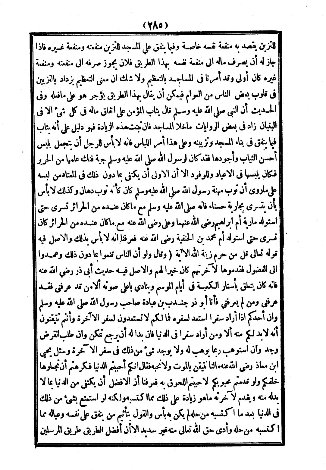 وَقَالَ: وَلَوْ أَنَّ النَّاسَ قَنَعُوا بِمَا دُونَ ذَلِكَ وَعَمَدُوا إلَى الْفُضُولِ فَقَدَّمُوهَا لِآخِرَتِهِمْ كَانَ خَيْرًا لَهُمْ وَالْأَصْلُ فِيهِ حَدِيثُ أَبِي ذَرٍّ - رَضِيَ اللَّهُ عَنْهُ -: فَإِنَّهُ كَانَ يَتَعَلَّقُ بِأَسْتَارِ الْكَعْبَةِ فِي أَيَّامِ الْمَوْسِمِ وَيُنَادِي بِأَعْلَى صَوْتِهِ، أَلَا مَنْ قَدْ عَرَفَنِي، فَقَدْ عَرَفَنِي، وَمَنْ لَمْ يَعْرِفْنِي فَأَنَا أَبُو ذَرٍّ جُنْدُبُ بْنُ جُنَادَةَ صَاحِبُ رَسُولِ اللَّهِ - صَلَّى اللَّهُ عَلَيْهِ وَسَلَّمَ - وَإِنَّ أَحَدَكُمْ إذَا أَرَادَ سَفَرًا اسْتَعَدَّ لِسَفَرِهِ فَمَا لَكُمْ لَا تَسْتَعِدُّونَ لِسَفَرِ الْآخِرَةِ وَأَنْتُمْ تَتَيَقَّنُونَ أَنَّهُ لَا بُدَّ لَكُمْ مِنْهُ، أَلَا وَمَنْ أَرَادَ سَفَرًا فِي الدُّنْيَا فَإِنْ بَدَا لَهُ أَنْ يَرْجِعَ تَمَكَّنَ وَإِنْ طَلَبَ الْقَرْضَ وَجَدَ، وَإِنْ اسْتَوْهَبَ رُبَّمَا يُوهَبُ لَهُ، وَلَا يُوجَدُ شَيْءٌ مِنْ ذَلِكَ فِي سَفَرِ الْآخِرَةِ وَسُئِلَ يَحْيَى بْنَ مُعَاذٍ - رَضِيَ اللَّهُ عَنْهُ - مَا لَنَا نَتَيَقَّنُ بِالْمَوْتِ وَلَا نُحِبُّهُ؟ فَقَالَ: إنَّكُمْ أَحْبَبْتُمْ الدُّنْيَا فَكَرِهْتُمْ أَنْ تَجْعَلُوهَا خَلْفَكُمْ، وَلَوْ قَدَّمْتُمْ مَحْبُوبَكُمْ لَأَحْبَبْتُمْ اللُّحُوقَ بِهِ فَعَرَفْنَا أَنَّ الْأَفْضَلَ أَنْ يَكْتَفِيَ مِنْ الدُّنْيَا بِمَا لَا بُدَّ لَهُ مِنْهُ وَيُقَدِّمَ لِآخِرَتِهِ مَا هُوَ زِيَادَةٌ عَلَى ذَلِكَ مِمَّا اكْتَسَبَهُ، وَلَكِنَّهُ لَوْ اسْتَمْتَعَ بِشَيْءٍ مِنْ ذَلِكَ فِي الدُّنْيَا بَعْدَ مَا اكْتَسَبَهُ مِنْ حِلِّهِ لَمْ يَكُنْ بِهِ بَأْسٌ وَالْقَوْلُ بِتَأْثِيمِ مَنْ يُنْفِقُ عَلَى نَفْسِهِ وَعِيَالِهِ مِمَّا اكْتَسَبَهُ مِنْ حِلِّهِ وَأَدَّى حَقَّ اللَّهِ تَعَالَى مِنْهُ غَيْرُ سَدِيدٍ إلَّا أَنَّ أَفْضَلَ الطَّرِيقِ طَرِيقُ الْمُرْسَلِينَ