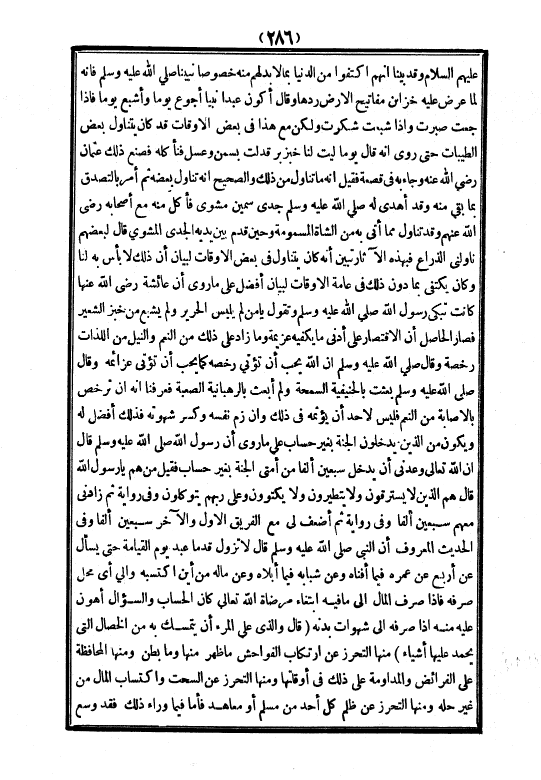 وَمَا زَادَ عَلَى ذَلِكَ مِنْ النِّعَمِ وَالنَّيْلُ مِنْ اللَّذَّاتِ رُخْصَةٌ وَقَالَ - صَلَّى اللَّهُ عَلَيْهِ وَسَلَّمَ - «إنَّ اللَّهَ يُحِبُّ أَنْ تُؤْتَى رُخَصُهُ، كَمَا يُحِبُّ أَنْ تُؤْتَى عَزَائِمُهُ» وَقَالَ - صَلَّى اللَّهُ عَلَيْهِ وَسَلَّمَ - «بُعِثْت بِالْحَنِيفِيَّةِ السَّمْحَةِ، وَلَمْ أُبْعَثْ بِالرَّهْبَانِيَّةِ الصَّعْبَةِ» فَعَرَفْنَا أَنَّهُ إنْ تَرَخَّصَ بِالْإِصَابَةِ مِنْ النِّعَمِ فَلَيْسَ لِأَحَدٍ أَنْ يُؤَثِّمَهُ فِي ذَلِكَ، وَإِنْ ذَمَّ نَفْسَهُ وَكَسَرَ شَهْوَتَهُ فَذَلِكَ أَفْضَلُ لَهُ وَيَكُونُ مِنْ الَّذِينَ يَدْخُلُونَ الْجَنَّةَ بِغَيْرِ حِسَابٍ عَلَى مَا رُوِيَ أَنَّ رَسُولَ اللَّهِ - صَلَّى اللَّهُ عَلَيْهِ وَسَلَّمَ - قَالَ «إنَّ اللَّهَ تَعَالَى وَعَدَنِي أَنْ يُدْخِلَ سَبْعِينَ أَلْفًا مِنْ أُمَّتِي الْجَنَّةَ بِغَيْرِ حِسَابٍ فَقِيلَ مَنْ هُمْ يَا رَسُولَ اللَّهِ قَالَ هُمْ الَّذِينَ لَا يَسْتَرِقُونَ، وَلَا يَتَطَيَّرُونَ، وَلَا يَكْتَوُونَ وَعَلَى رَبِّهِمْ يَتَوَكَّلُونَ»، وَفِي رِوَايَةٍ «ثُمَّ زَادَنِي مَعَهُمْ سَبْعِينَ أَلْفًا»، وَفِي رِوَايَةٍ «ثُمَّ أَضْعَفَ لِي مَعَ الْفَرِيقِ الْأَوَّلِ وَالْآخَرِ سَبْعِينَ أَلْفًا»، وَفِي الْحَدِيثِ الْمَعْرُوفِ أَنَّ النَّبِيَّ - صَلَّى اللَّهُ عَلَيْهِ وَسَلَّمَ - قَالَ «لَا تَزُولُ قَدَمَا عَبْدٍ يَوْمَ الْقِيَامَةِ حَتَّى يُسْأَلَ عَنْ أَرْبَعٍ: عَنْ عُمْرِهِ فِيمَا أَفْنَاهُ، وَعَنْ شَبَابِهِ فِيمَا أَبْلَاهُ، وَعَنْ مَالِهِ مِنْ أَيْنَ اكْتَسَبَهُ وَإِلَى أَيِّ مَحَلٍّ صَرَفَهُ»، فَإِذَا صَرَفَ الْمَالَ إلَى مَا فِيهِ ابْتِغَاءُ مَرْضَاةِ اللَّهِ تَعَالَى كَانَ الْحِسَابُ وَالسُّؤَالُ أَهْوَنَ عَلَيْهِ مِنْهُ إذَا صَرَفَهُ إلَى شَهَوَاتِ بَدَنِهِ