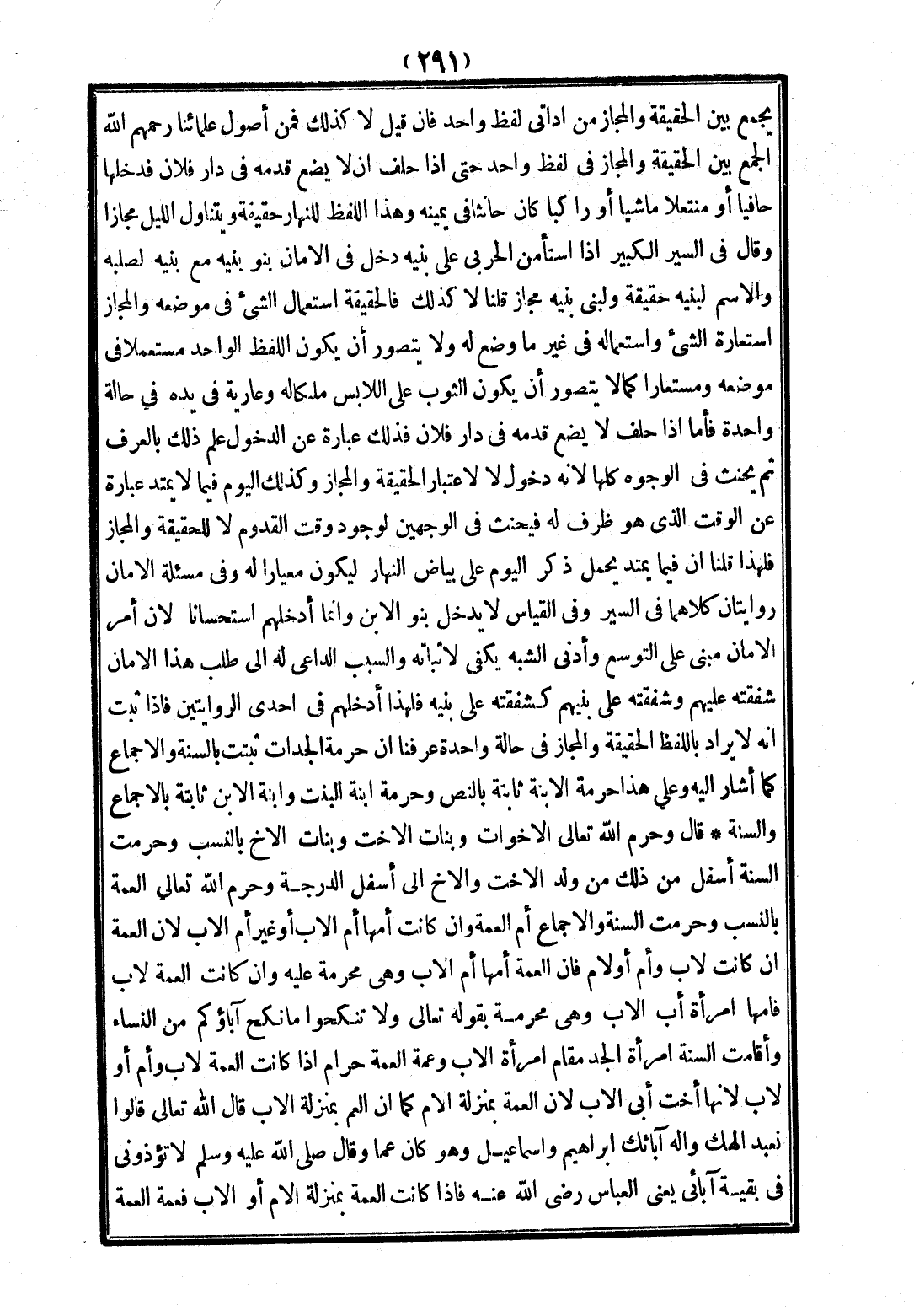 يُجْمَعُ بَيْنَ الْحَقِيقَةِ وَالْمَجَازِ مِنْ أَدَاتَيْ لَفْظٍ وَاحِدٍ فَإِنْ قِيلَ: لَا كَذَلِكَ فَمِنْ أُصُولِ عُلَمَائِنَا - رَحِمَهُمُ اللَّهُ - الْجَمْعُ بَيْنَ الْحَقِيقَةِ وَالْمَجَازِ فِي لَفْظٍ وَاحِدٍ حَتَّى إذَا حَلَفَ أَنْ لَا يَضَعَ قَدَمَهُ فِي دَارِ فُلَانٍ فَدَخَلَهَا حَافِيًا أَوْ مُنْتَعِلًا مَاشِيًا أَوْ رَاكِبًا كَانَ حَانِثًا فِي يَمِينِهِ، وَهَذَا اللَّفْظُ لِلنَّهَارِ حَقِيقَةً وَيَتَنَاوَلُ اللَّيْلَ مَجَازًا وَقَالَ فِي السِّيَرِ الْكَبِيرِ إذَا اسْتَأْمَنَ الْحَرْبِيُّ عَلَى بَنِيهِ دَخَلَ فِي الْأَمَانِ بَنُو بَنِيهِ مَعَ بَنِيهِ لِصُلْبِهِ وَالِاسْمُ لِبَنِيهِ حَقِيقَةٌ وَلِبَنِي بَنِيهِ مَجَازٌ قُلْنَا: لَا كَذَلِكَ فَالْحَقِيقَةُ اسْتِعْمَالُ الشَّيْءِ فِي مَوْضِعِهِ وَالْمَجَازُ اسْتِعَارَةُ الشَّيْءِ وَاسْتِعْمَالُهُ فِي غَيْرِ مَا وُضِعَ لَهُ وَلَا يُتَصَوَّرُ أَنْ يَكُونَ اللَّفْظُ الْوَاحِدُ مُسْتَعْمَلًا فِي مَوْضِعِهِ وَمُسْتَعَارًا كَمَا لَا يُتَصَوَّرُ أَنْ يَكُونَ الثَّوْبُ عَلَى اللَّابِسِ مِلْكًا لَهُ وَعَارِيَّةً فِي يَدِهِ فِي حَالَةٍ وَاحِدَةٍ فَأَمَّا إذَا حَلَفَ لَا يَضَعُ قَدَمَهُ فِي دَارِ فُلَانٍ فَذَلِكَ عِبَارَةٌ عَنْ الدُّخُولِ عَلِمَ ذَلِكَ بِالْعُرْفِ ثُمَّ يَحْنَثُ فِي الْوُجُوهِ كُلِّهَا؛ لِأَنَّهُ دُخُولٌ لَا لِاعْتِبَارِ الْحَقِيقَةِ وَالْمَجَازِ، وَكَذَلِكَ الْيَوْمُ فِيمَا لَا يَمْتَدُّ عِبَارَةٌ عَنْ الْوَقْتِ الَّذِي هُوَ ظَرْفٌ لَهُ فَيَحْنَثُ فِي الْوَجْهَيْنِ لِوُجُودِ وَقْتِ الْقُدُومِ لَا لِلْحَقِيقَةِ وَالْمَجَازِ، فَلِهَذَا قُلْنَا إنَّ فِيمَا يَمْتَدُّ يُحْمَلُ ذِكْرُ الْيَوْمِ عَلَى بَيَاضِ النَّهَارِ لِيَكُونَ مِعْيَارًا لَهُ، وَفِي مَسْأَلَةِ الْأَمَانِ رِوَايَتَانِ كِلَاهُمَا فِي السِّيَرِ.