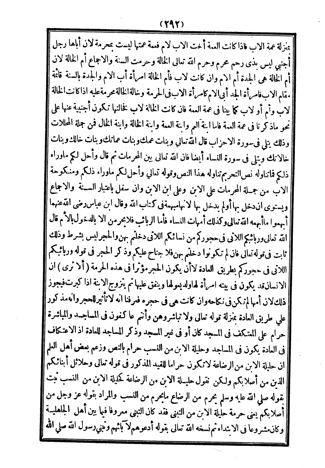 وَحَلِيلَةُ الِابْنِ مِنْ النَّسَبِ حَرَامٌ بِالنَّصِّ وَزَعَمَ بَعْضُ أَهْلِ الْعِلْمِ أَنَّ حَلِيلَةَ الِابْنِ مِنْ الرَّضَاعَةِ لَا تَكُونُ حَرَامًا لِلْقَيْدِ الْمَذْكُورِ فِي قَوْله تَعَالَى {وَحَلَائِلُ أَبْنَائِكُمْ الَّذِينَ مِنْ أَصْلَابِكُمْ} [النساء: 23] وَلَكِنْ نَقُولُ حَلِيلَةُ الِابْنِ مِنْ الرَّضَاعَةِ كَحَلِيلَةِ الِابْنِ مِنْ النَّسَبِ ثَبَتَ بِقَوْلِهِ - صَلَّى اللَّهُ عَلَيْهِ وَسَلَّمَ - «يَحْرُمُ مِنْ الرَّضَاعِ مَا يَحْرُمُ مِنْ النَّسَبِ» وَالْمُرَادُ بِقَوْلِهِ عَزَّ وَجَلَّ مِنْ أَصْلَابِكُمْ يَعْنِي حُرْمَةَ حَلِيلَةِ الِابْنِ مِنْ التَّبَنِّي، فَقَدْ كَانَ التَّبَنِّي مَعْرُوفًا فِيمَا بَيْنَ أَهْلِ الْجَاهِلِيَّةِ وَكَانَ مَشْرُوعًا فِي الِابْتِدَاءِ ثُمَّ نَسَخَهُ اللَّهُ تَعَالَى بِقَوْلِهِ {اُدْعُوهُمْ لِآبَائِهِمْ} [الأحزاب: 5]، «وَتَبَنَّى رَسُولُ اللَّهِ - صَلَّى اللَّهُ عَلَيْهِ وَسَلَّمَ -