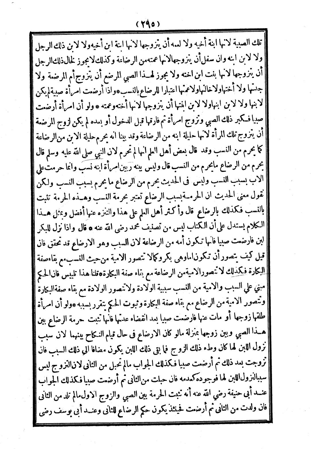 وَلَوْ أَنَّ امْرَأَةً أَرْضَعَتْ صَبِيًّا فَكَبِرَ ذَلِكَ الصَّبِيُّ وَتَزَوَّجَ امْرَأَةً ثُمَّ فَارَقَهَا قَبْلَ الدُّخُولِ أَوْ بَعْدَهُ لَمْ يَكُنْ لِزَوْجِ الْمُرْضِعَةِ أَنْ يَتَزَوَّجَ تِلْكَ الْمَرْأَةَ؛ لِأَنَّهَا حَلِيلَةُ ابْنِهِ مِنْ الرَّضَاعَةِ، وَقَدْ بَيَّنَّا أَنَّهُ يَحْرُمُ حَلِيلَةُ الِابْنِ مِنْ الرَّضَاعَةِ كَمَا يَحْرُمُ مِنْ النَّسَبِ، وَقَدْ قَالَ بَعْضُ أَهْلِ الْعِلْمِ: إنَّهَا لَمْ تَحْرُمْ؛ لِأَنَّ النَّبِيَّ - صَلَّى اللَّهُ عَلَيْهِ وَسَلَّمَ - قَالَ «يَحْرُمُ مِنْ الرَّضَاعِ مَا يَحْرُمُ مِنْ النَّسَبِ» قَالَ وَلَيْسَ بَيْنَهُ وَبَيْنَ امْرَأَةِ ابْنِهِ نَسَبٌ، وَإِنَّمَا حَرُمَتْ عَلَى الْأَبِ بِسَبَبِ النَّسَبِ وَلَيْسَ فِي الْحَدِيثِ يَحْرُمُ مِنْ الرَّضَاعِ مَا يَحْرُمُ بِسَبَبِ النَّسَبِ وَلَكِنْ نَقُولُ مَعْنَى الْحَدِيثِ أَنَّ الْحُرْمَةَ بِسَبَبِ الرَّضَاعِ تُعْتَبَرُ بِحُرْمَةِ النَّسَبِ وَهَذِهِ الْحُرْمَةُ تَثْبُتُ بِالنَّسَبِ فَكَذَلِكَ بِالرَّضَاعِ قَالَ وَأَكْثَرُ أَهْلِ الْعِلْمِ عَلَى هَذَا وَالتَّنَزُّهُ عَنْهَا أَفْضَلُ وَبِمِثْلِ هَذَا الْكَلَامِ يُسْتَدَلُّ عَلَى أَنَّ الْكِتَابَ لَيْسَ مِنْ تَصْنِيفِ مُحَمَّدٍ - رَضِيَ اللَّهُ عَنْهُ -
