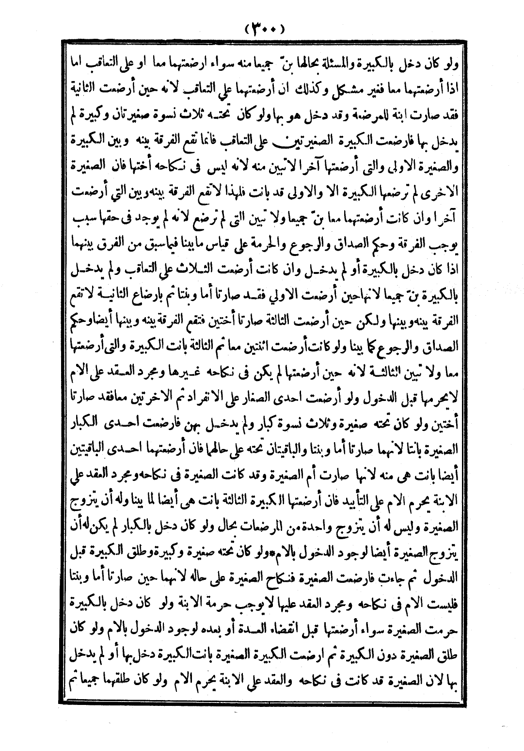 وَلَوْ كَانَ تَحْتَهُ ثَلَاثُ نِسْوَةٍ صَغِيرَتَانِ وَكَبِيرَةٌ لَمْ يَدْخُلْ بِهَا فَأَرْضَعَتْ الْكَبِيرَةُ الصَّغِيرَتَيْنِ عَلَى التَّعَاقُبِ، فَإِنَّمَا تَقَعُ الْفُرْقَةُ بَيْنَهُ وَبَيْنَ الْكَبِيرَةِ وَالصَّغِيرَةِ الْأُولَى وَاَلَّتِي أَرْضَعَتْهَا آخِرًا لَا تَبِينُ مِنْهُ؛ لِأَنَّهُ لَيْسَ فِي نِكَاحِهِ أُخْتُهَا، فَإِنَّ الصَّغِيرَةَ الْأُخْرَى لَمْ تُرْضِعْهَا الْكَبِيرَةُ أَوَّلًا وَالْأُولَى قَدْ بَانَتْ، فَلِهَذَا لَا تَقَعُ الْفُرْقَةُ بَيْنَهُ وَبَيْنَ الَّتِي أُرْضِعَتْ آخِرًا، وَإِنْ كَانَتْ أَرْضَعَتْهُمَا مَعًا بِنَّ جَمِيعًا، وَلَا تَبِينُ الَّتِي لَمْ تُرْضِعْ؛ لِأَنَّهُ لَمْ يُوجَدْ فِي حَقِّهَا سَبَبٌ يُوجِبُ الْفُرْقَةَ.