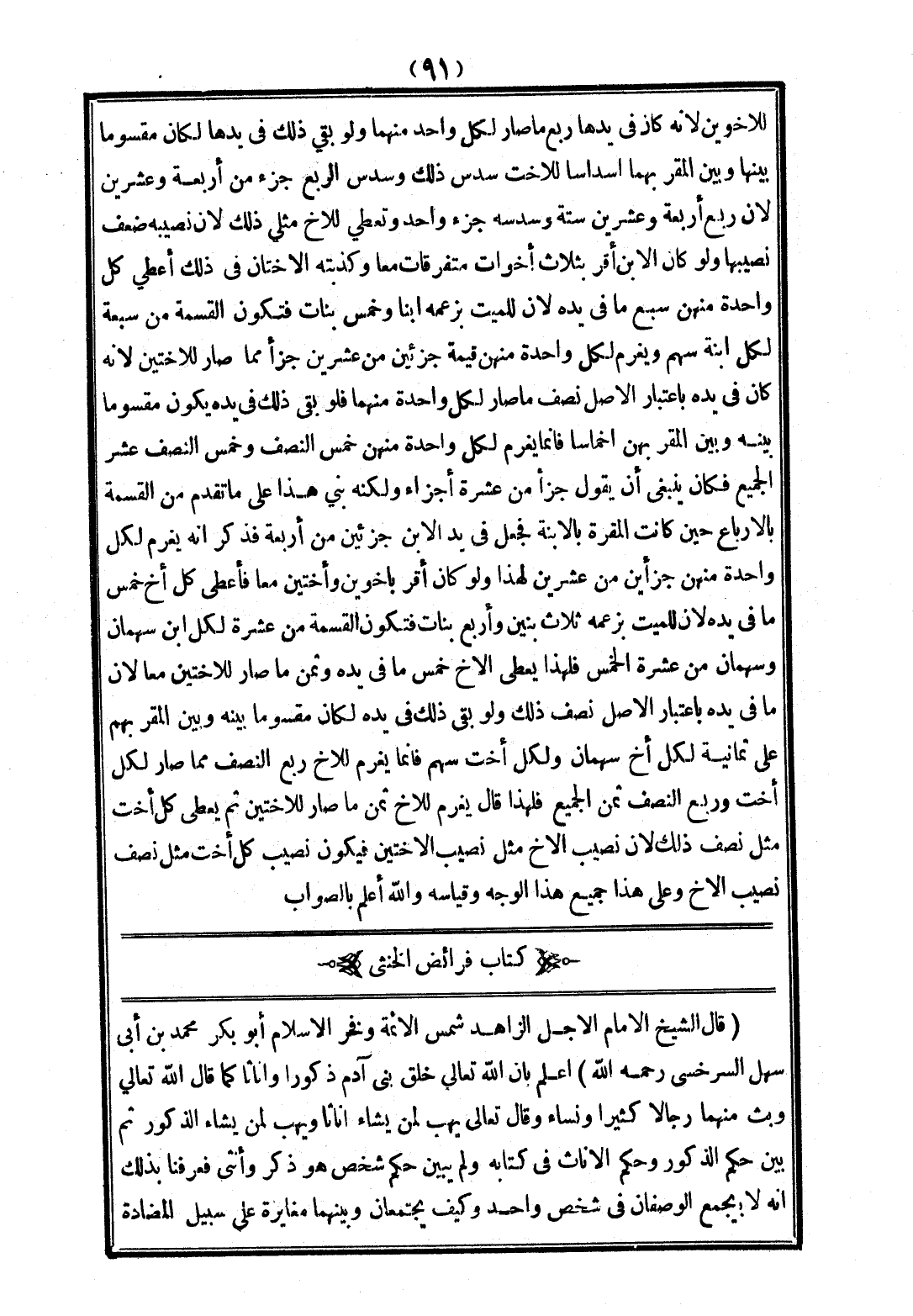 (قَالَ الشَّيْخُ الْإِمَامُ الْأَجَلُّ الزَّاهِدُ شَمْسُ الْأَئِمَّةِ وَفَخْرُ الْإِسْلَامِ أَبُو بَكْرٍ مُحَمَّدُ بْنُ أَبِي سَهْلٍ السَّرَخْسِيُّ - رَحِمَهُ اللَّهُ -) اعْلَمْ بِأَنَّ اللَّهَ تَعَالَى خَلَقَ بَنِي آدَمَ ذُكُورًا وَإِنَاثًا كَمَا قَالَ اللَّهُ تَعَالَى {وَبَثَّ مِنْهُمَا رِجَالًا كَثِيرًا وَنِسَاءً} [النساء: 1] وَقَالَ تَعَالَى {يَهَبُ لِمَنْ يَشَاءُ إنَاثًا وَيَهَبُ لِمَنْ يَشَاءُ الذُّكُورَ} [الشورى: 49] ثُمَّ بَيَّنَ حُكْمَ الذُّكُورِ وَحُكْمَ الْإِنَاثِ فِي كِتَابِهِ وَلَمْ يُبَيِّنْ حُكْمَ شَخْصٍ هُوَ ذَكَرٌ وَأُنْثَى فَعَرَفْنَا بِذَلِكَ أَنَّهُ لَا يُجْمَعُ الْوَصْفَانِ فِي شَخْصٍ وَاحِدٍ وَكَيْف يَجْتَمِعَانِ وَبَيْنَهُمَا مُغَايِرَةٌ عَلَى سَبِيلِ الْمُضَادَّةِ،
