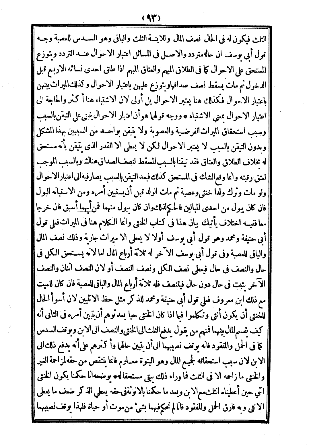 وَلَوْ مَاتَ وَتَرَكَ وَلَدًا خُنْثَى وَعَصَبَةً، ثُمَّ مَاتَ الْوَلَدُ قَبْلَ أَنْ يَسْتَبِينَ أَمْرُهُ وَمِنْ الِاسْتِبَانَةِ الْبَوْلُ فَإِنْ كَانَ يَبُولُ مِنْ إحْدَى الْمَبَالَيْنِ فَالْحُكْمُ لِذَلِكَ، وَإِنْ كَانَ يَبُولُ مِنْهُمَا فَمِنْ أَيِّهِمَا أَسْبَقَ فَإِنْ خَرَجَا مَعًا فَفِيهِ اخْتِلَافٌ يَأْتِيك بَيَانُ هَذَا فِي كِتَابِ الْخُنْثَى، وَإِنَّمَا الْكَلَامُ هُنَا فِي الْمِيرَاثِ فَعَلَى قَوْلِ أَبِي حَنِيفَةَ وَمُحَمَّدٍ وَهُوَ قَوْلُ أَبِي يُوسُفَ أَوَّلًا لَا يُعْطَى إلَّا مِيرَاثَ جَارِيَةٍ وَذَلِكَ نِصْفُ الْمَالِ وَالْبَاقِي لِلْعَصَبَةِ، وَفِي قَوْلِ أَبِي يُوسُفَ الْآخَرِ لَهُ ثَلَاثَةُ أَرْبَاعِ الْمَالِ إمَّا لِأَنَّهُ يَسْتَحِقُّ الْكُلَّ فِي حَالٍ وَالنِّصْفَ فِي حَالٍ فَيُعْطَى نِصْفَ الْكُلِّ وَنِصْفَ النِّصْفِ أَوْ لِأَنَّ النِّصْفَ اثْنَانِ وَالنِّصْفُ الْآخَرُ يَثْبُتُ فِي حَالٍ دُونَ حَالٍ فَيَتَنَصَّفُ فَلَهُ ثَلَاثَةُ أَرْبَاعِ الْمَالِ وَالْبَاقِي لِلْعَصَبَةِ، فَإِنْ كَانَ لِلْمَيِّتِ مَعَ ذَلِكَ ابْنٌ مَعْرُوفٌ فَعَلَى قَوْلِ أَبِي حَنِيفَةَ وَمُحَمَّدٍ لِلذَّكَرِ مِثْلُ حَظِّ الْأُنْثَيَيْنِ؛ لِأَنَّ أَسْوَأَ الْحَالِ لِلْخُنْثَى أَنْ يَكُونَ أُنْثَى وَتَكَلَّمُوا فِيمَا إذَا كَانَ الْخُنْثَى حَيًّا بَعْدَ تَوَهُّمِ أَنْ يَتَبَيَّنَ أَمْرُهُ فِي الثَّانِي أَنَّهُ كَيْفَ يُقَسَّمُ الْمَالُ بَيْنَهُمَا فَمِنْهُمْ مَنْ يَقُولُ يُدْفَعُ الثُّلُثُ إلَى الْخُنْثَى وَالنِّصْفُ إلَى الِابْنِ وَيُوقَفُ السُّدُسُ كَمَا فِي الْحَمْلِ وَالْمَفْقُودِ فَإِنَّهُ يُوقَفُ نَصِيبُهُمَا إلَى أَنْ يَتَبَيَّنَ حَالُهُمَا، وَأَكْثَرُهُمْ عَلَى أَنَّهُ يُدْفَعُ ذَلِكَ إلَى الِابْنِ؛ لِأَنَّ سَبَبَ اسْتِحْقَاقِهِ لِجَمِيعِ الْمَالِ وَهُوَ الْبُنُوَّةُ مَعْلُومٌ فَإِنَّمَا يُنْتَقَصُ مِنْ حَقِّهِ لِمُزَاحَمَةِ الْغَيْرِ وَالْخُنْثَى مَا زَاحَمَهُ إلَّا فِي الثُّلُثِ فَمَا وَرَاءَ ذَلِكَ يَبْقَى مُسْتَحَقًّا لَهُ.