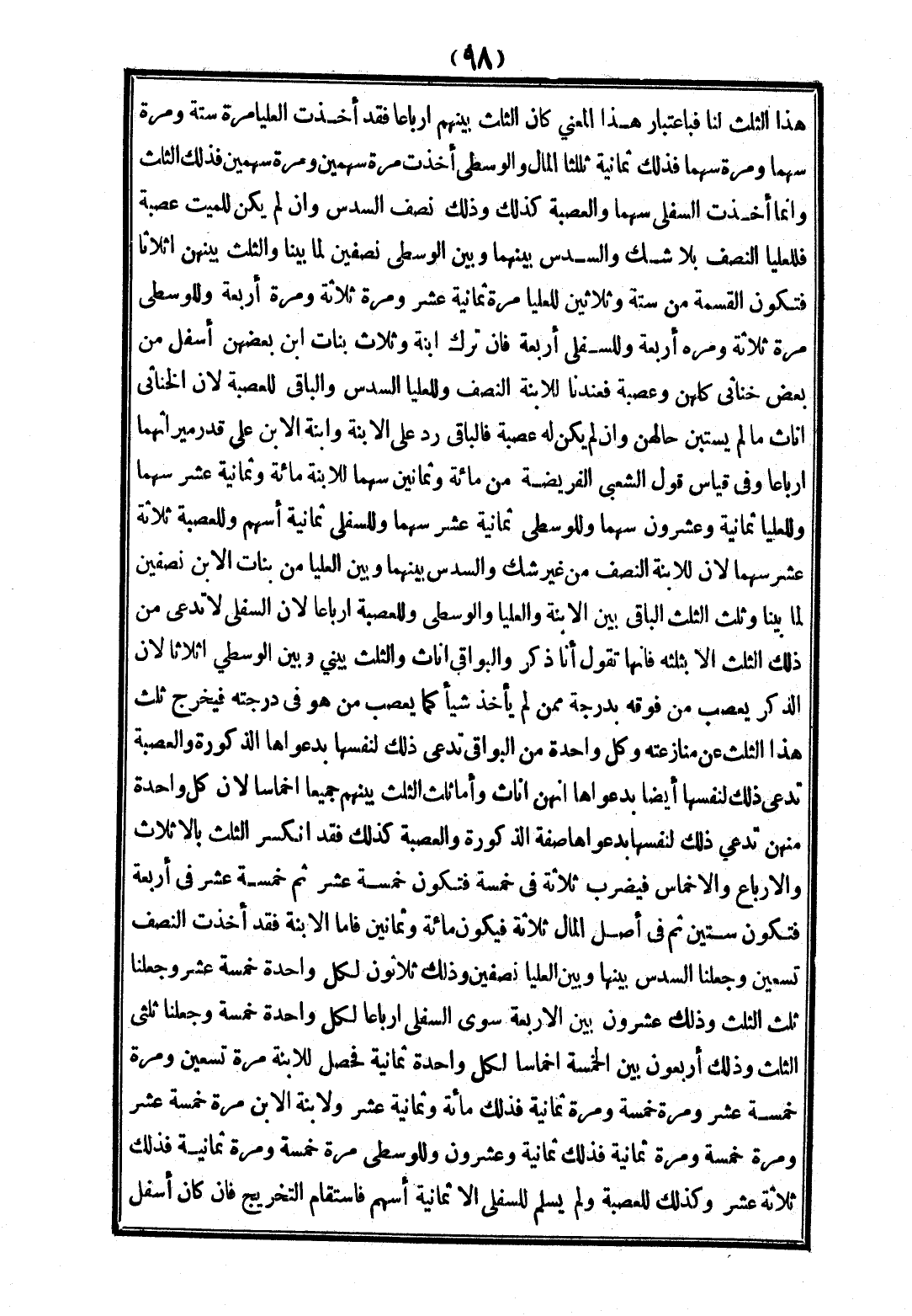 هَذَا الثُّلُثُ لَنَا، فَبِاعْتِبَارِ هَذَا الْمَعْنَى كَانَ الثُّلُثُ بَيْنَهُمْ أَرْبَاعًا فَقَدْ أَخَذَتْ الْعُلْيَا مَرَّةً سِتَّةً وَمَرَّةً سَهْمًا وَمَرَّةً سَهْمًا فَذَلِكَ ثَمَانِيَةٌ ثُلُثَا الْمَالِ، وَالْوُسْطَى أَخَذَتْ مَرَّةً سَهْمَيْنِ وَمَرَّةً سَهْمَيْنِ فَذَلِكَ الثُّلُثُ، وَإِنَّمَا أَخَذَتْ السُّفْلَى سَهْمًا وَالْعَصَبَةُ كَذَلِكَ وَذَلِكَ نِصْفُ السُّدُسِ، وَإِنْ لَمْ يَكُنْ لِلْمَيِّتِ عَصَبَةٌ فَلِلْعُلْيَا النِّصْفُ بِلَا شَكٍّ وَالسُّدُسُ بَيْنَهُمَا وَبَيْنَ الْوُسْطَى نِصْفَيْنِ لِمَا بَيَّنَّا وَالثُّلُثُ بَيْنَهُنَّ أَثْلَاثًا فَتَكُونُ الْقِسْمَةُ مِنْ سِتَّةٍ وَثَلَاثِينَ لِلْعُلْيَا مَرَّةً ثَمَانِيَةَ عَشَرَ وَمَرَّةً ثَلَاثَةٌ وَمَرَّةً أَرْبَعَةٌ وَلِلْوُسْطَى مَرَّةً ثَلَاثَةٌ وَمَرَّةً أَرْبَعَةٌ وَلِلسُّفْلَى أَرْبَعَةٌ، فَإِنْ تَرَكَ ابْنَةً وَثَلَاثَ بَنَاتِ ابْنٍ بَعْضُهُنَّ أَسْفَلُ مِنْ بَعْضٍ خَنَاثَى كُلُّهُنَّ وَعَصَبَةٌ فَعِنْدَنَا لِلِابْنَةِ النِّصْفُ وَلِلْعُلْيَا السُّدُسُ وَالْبَاقِي لِلْعَصَبَةِ؛ لِأَنَّ الْخَنَاثَى إنَاثٌ مَا لَمْ يَسْتَبِنْ حَالُهُنَّ، وَإِنْ لَمْ يَكُنْ لَهُ عَصَبَةٌ فَالْبَاقِي رَدٌّ عَلَى الِابْنَةِ وَابْنَةِ الِابْنِ عَلَى قَدْرِ مِيرَاثِهِمَا أَرْبَاعًا.