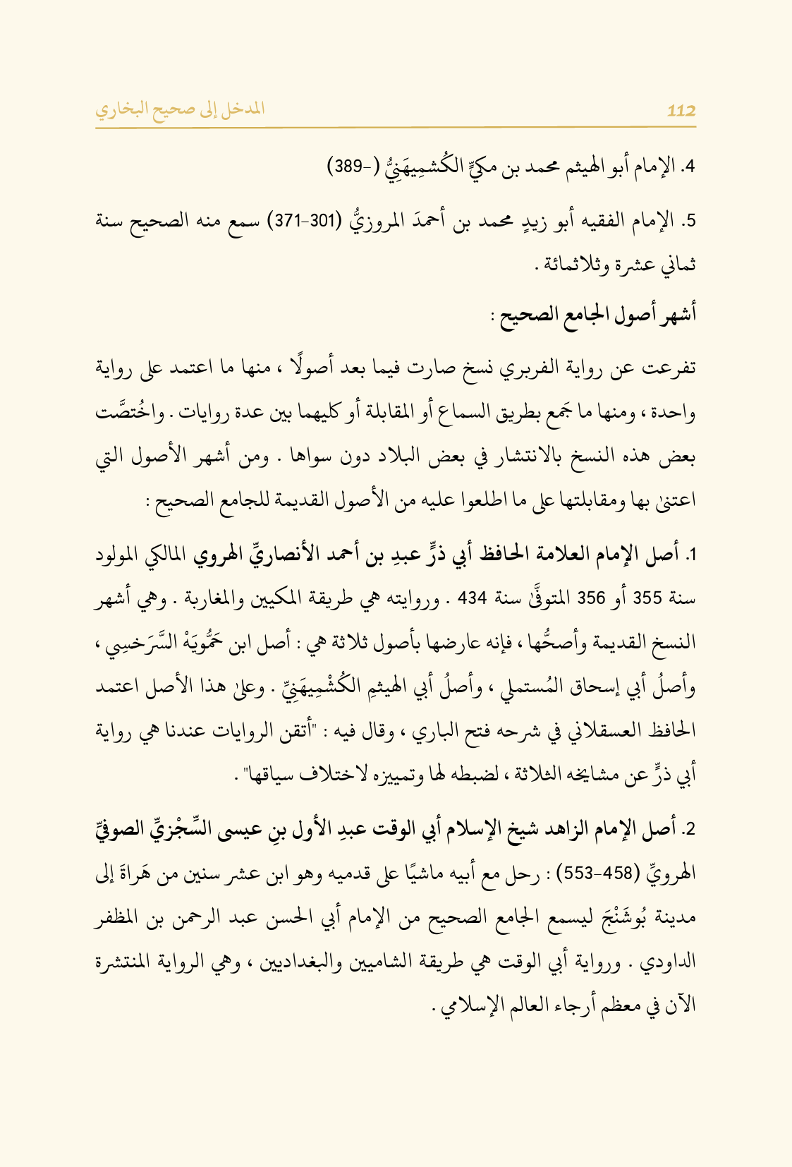 ١. أصل الإمام العلامة الحافظ أبي ذرٍّ عبدِ بن أحمد الأنصاريِّ الهروي المالكي المولود سنة ٣٥٥ أو ٣٥٦ المتوفَّى سنة ٤٣٤. وروايته هي طريقة المكيين والمغاربة. وهي أشهر النسخ القديمة وأصحُّها، فإنه عارضها بأصول ثلاثة هي: أصل ابن حَمُّويَهْ السَّرَخسِي، وأصلُ أبي إسحاق المُستملي، وأصلُ أبي الهيثمِ الكُشْمِيهَنِيِّ. وعلى هذا الأصل اعتمد الحافظ العسقلاني في شرحه فتح الباري، وقال فيه: "أتقن الروايات عندنا هي رواية أبي ذرٍّ عن مشايخه الثلاثة، لضبطه لها وتمييزه لاختلاف سياقها".