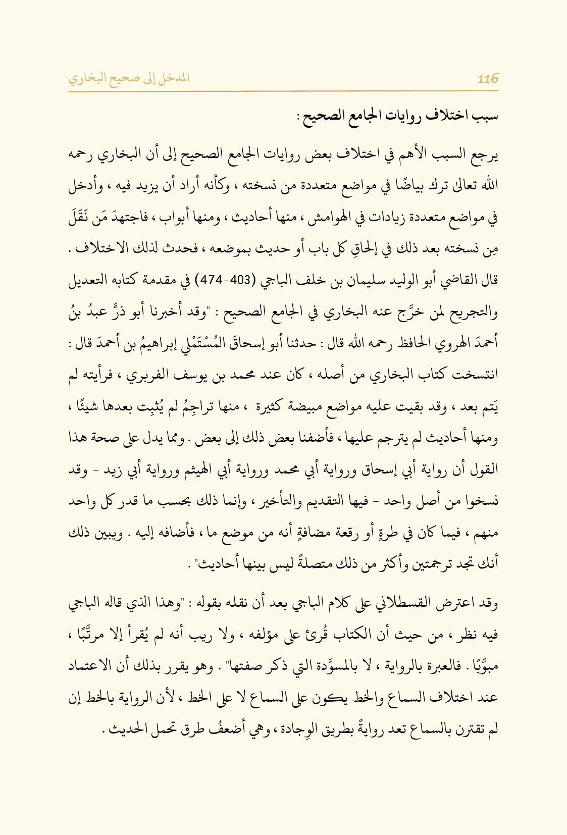 وقد اعترض القسطلاني على كلام الباجي بعد أن نقله بقوله: "وهذا الذي قاله الباجي فيه نظر، من حيث أن الكتاب قُرئ على مؤلفه، ولا ريب أنه لم يُقرأ إلا مرتَّبًا، مبوَّبًا .. فالعبرة بالرواية، لا بالمسوَّدة التي ذكر صفتها". وهو يقرر بذلك أن الاعتماد عند اختلاف السماع والخط يكون على السماع لا على الخط، لأن الرواية بالخط إن لم تقترن بالسماع تعد روايةً بطريق الوِجادة، وهي أضعفُ طرق تحمل الحديث.