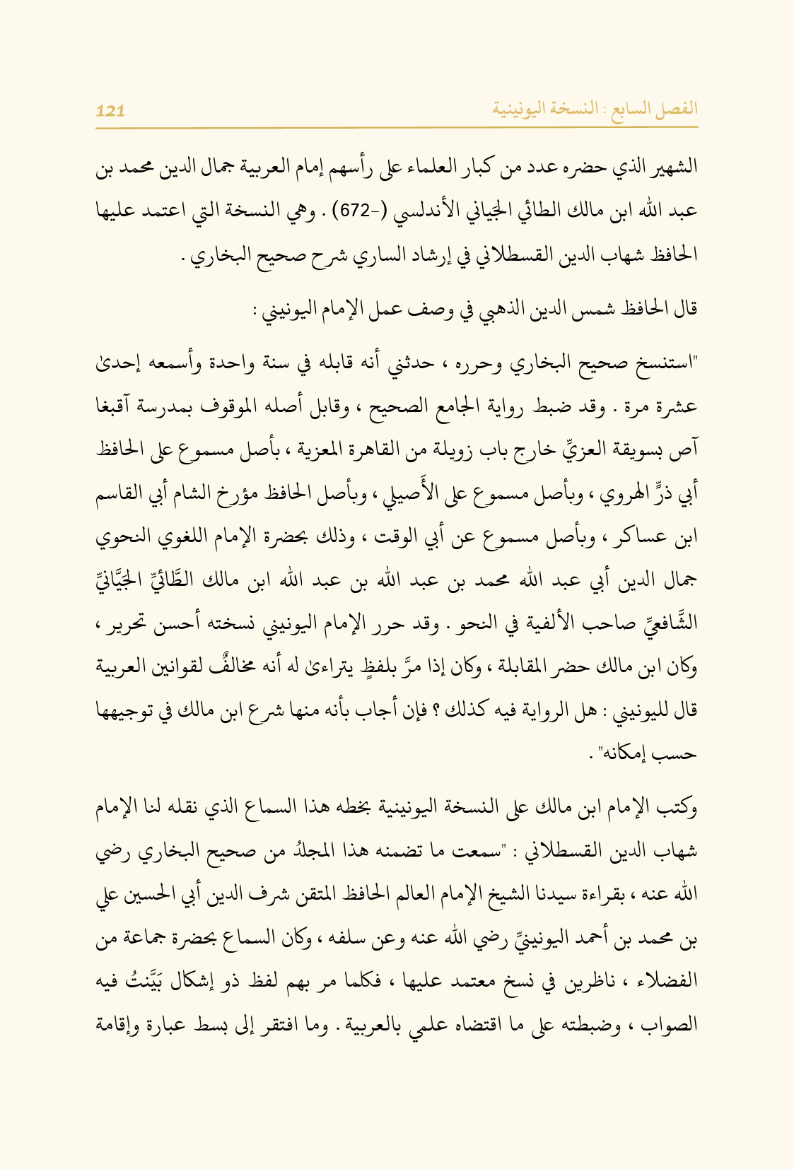 "استنسخ صحيح البخاري وحرره، حدثني أنه قابله في سنة واحدة وأسمعه إحدى عشرة مرة. وقد ضبط رواية الجامع الصحيح، وقابل أصله الموقوف بمدرسة آقبغا آص بسويقة العزيِّ خارج باب زويلة من القاهرة المعزية، بأصل مسموع على الحافظ أبي ذرٍّ الهروي، وبأصل مسموع على الأَصيلي، وبأصل الحافظ مؤرخ الشام أبي القاسم ابن عساكر، وبأصل مسموع عن أبي الوقت، وذلك بحضرة الإمام اللغوي النحوي جمال الدين أبي عبد الله محمد بن عبد الله بن عبد الله ابن مالك الطَّائيِّ الجَيَّانيِّ الشَّافعيِّ صاحب الألفية في النحو. وقد حرر الإمام اليونيني نسخته أحسن تحرير، وكان ابن مالك حضر المقابلة، وكان إذا مرَّ بلفظٍ يتراءى له أنه مخالفٌ لقوانين العربية قال لليونيني: هل الرواية فيه كذلك؟ فإن أجاب بأنه منها شرع ابن مالك في توجيهها حسب إمكانه".