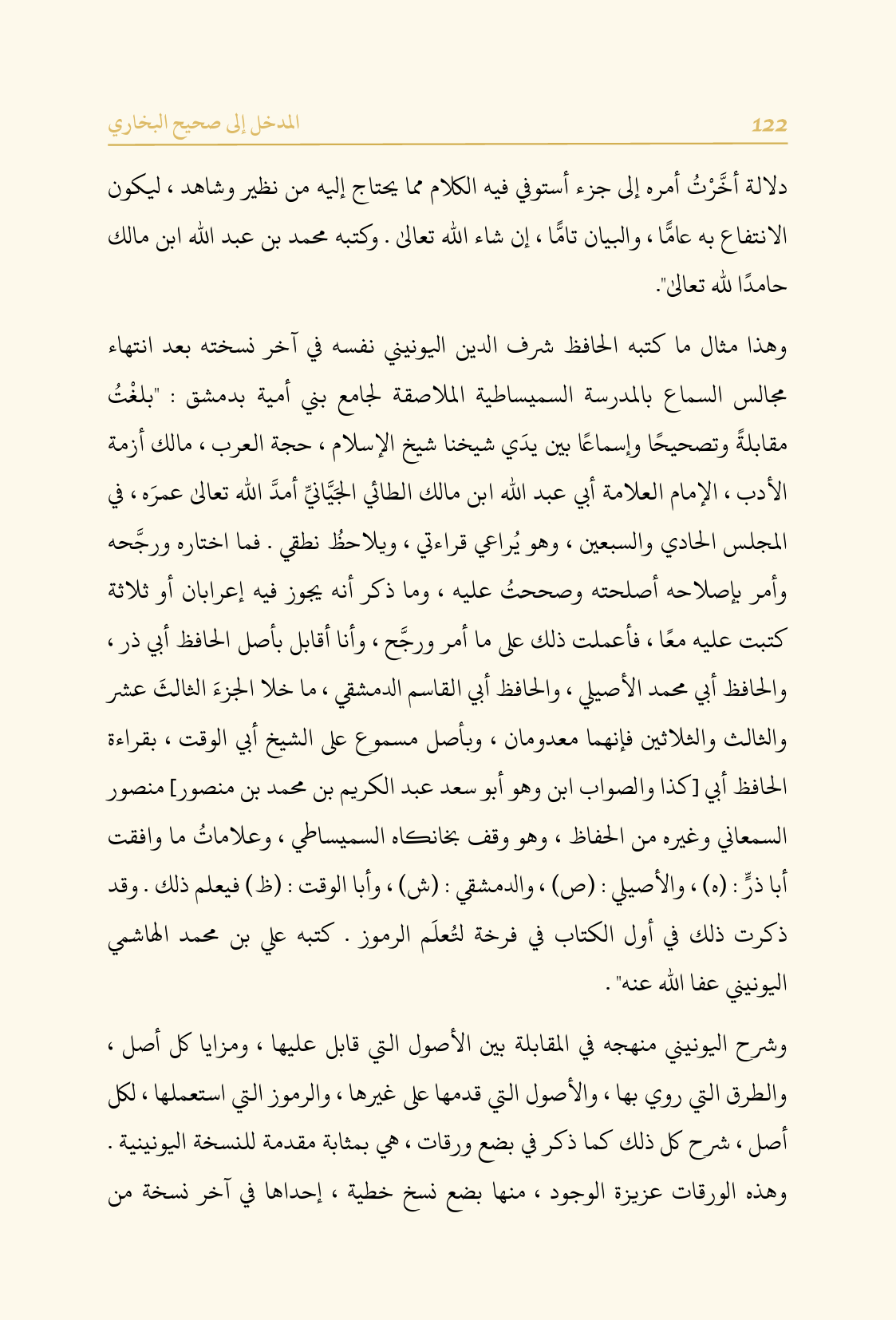 وهذا مثال ما كتبه الحافظ شرف الدين اليونيني نفسه في آخر نسخته بعد انتهاء مجالس السماع بالمدرسة السميساطية الملاصقة لجامع بني أمية بدمشق: "بلغْتُ مقابلةً وتصحيحًا وإسماعًا بين يدَي شيخنا شيخ الإسلام، حجة العرب، مالك أزمة الأدب، الإمام العلامة أبي عبد الله ابن مالك الطائي الجَيَّانيِّ أمدَّ الله تعالى عمرَه.، في المجلس الحادي والسبعين، وهو يُراعي قراءتي، ويلاحظُ نطقي. فما اختاره ورجَّحه وأمر بإصلاحه أصلحته وصححتُ عليه، وما ذكر أنه يجوز فيه إعرابان أو ثلاثة كتبت عليه معًا، فأعملت ذلك على ما أمر ورجَّح، وأنا أقابل بأصل الحافظ أبي ذر، والحافظ أبي محمد الأصيلي، والحافظ أبي القاسم الدمشقي، ما خلا الجزءَ الثالثَ عشر والثالث والثلاثين فإنهما معدومان، وبأصل مسموع على الشيخ أبي الوقت، بقراءة الحافظ أبي [كذا والصواب ابن وهو أبو سعد عبد الكريم بن محمد بن منصور] منصور السمعاني وغيره من الحفاظ، وهو وقف بخانكاه السميساطي، وعلاماتُ ما وافقت أبا ذرٍّ: (هـ)، والأصيلي: (ص)، والدمشقي: (ش)، وأبا الوقت: (ظ) فيعلم ذلك. وقد ذكرت ذلك في أول الكتاب في فرخة لتُعلَم الرموز. كتبه علي بن محمد الهاشمي اليونيني عفا الله عنه".
