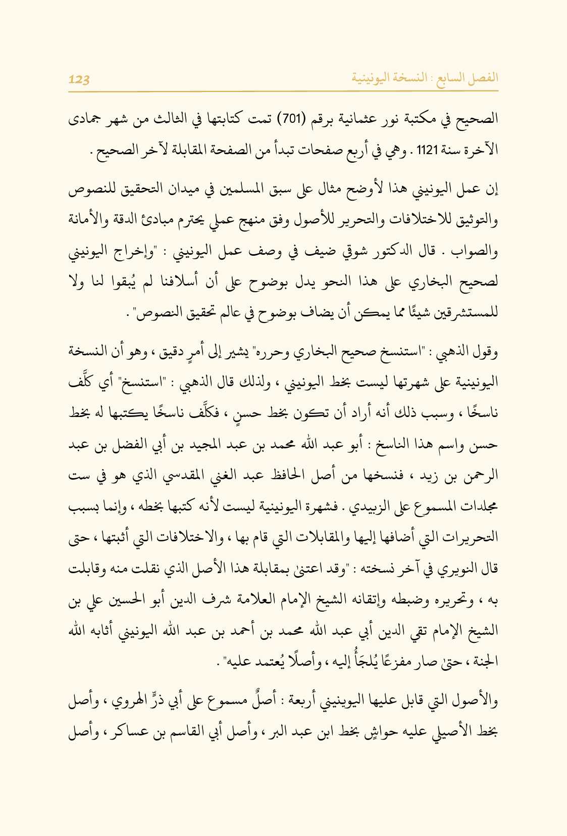 إن عمل اليونيني هذا لأوضح مثال على سبق المسلمين في ميدان التحقيق للنصوص والتوثيق للاختلافات والتحرير للأصول وفق منهج عملي يحترم مبادئ الدقة والأمانة والصواب. قال الدكتور شوقي ضيف في وصف عمل اليونيني: "وإخراج اليونيني لصحيح البخاري على هذا النحو يدل بوضوح على أن أسلافنا لم يُبقوا لنا ولا للمستشرقين شيئًا مما يمكن أن يضاف بوضوح في عالم تحقيق النصوص".
