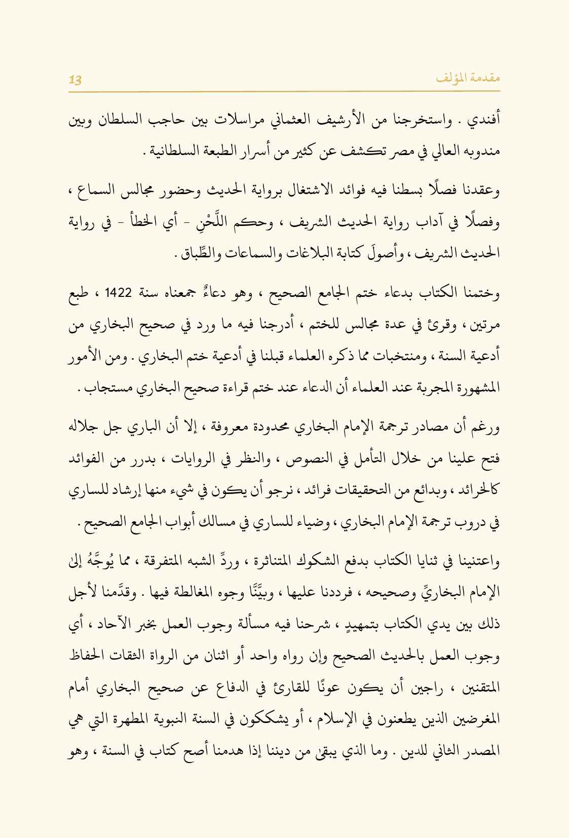 واعتنينا في ثنايا الكتاب بدفع الشكوك المتناثرة، وردِّ الشبه المتفرقة، مما يُوجَّهُ إلى الإمام البخاريِّ وصحيحه، فرددنا عليها، وبيَّنَّا وجوه المغالطة فيها. وقدَّمنا لأجل ذلك بين يدي الكتاب بتمهيدٍ، شرحنا فيه مسألة وجوب العمل بخبر الآحاد، أي وجوب العمل بالحديث الصحيح وإن رواه واحد أو اثنان من الرواة الثقات الحفاظ المتقنين، راجين أن يكون عونًا للقارئ في الدفاع عن صحيح البخاري أمام المغرضين الذين يطعنون في الإسلام، أو يشككون في السنة النبوية المطهرة التي هي المصدر الثاني للدين. وما الذي يبقى من ديننا إذا هدمنا أصح كتاب في السنة، وهو