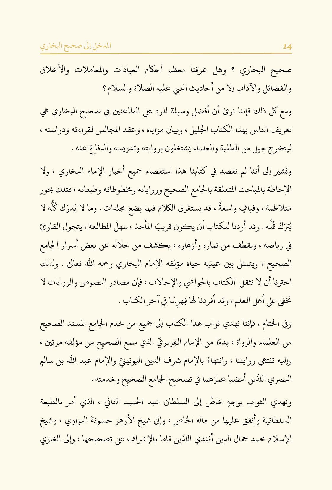 ونشير إلى أننا لم نقصد في كتابنا هذا استقصاء جميع أخبار الإمام البخاري، ولا الإحاطة بالمباحث المتعلقة بالجامع الصحيح ورواياته ومخطوطاته وطبعاته، فتلك بحور متلاطمة.، وفيافٍ واسعةٌ، قد يستغرق الكلام فيها بضع مجلدات. وما لا يُدرَك كُلُّه لا يُترَكُ قُلُّه. وقد أردنا للكتاب أن يكون قريبَ المأخذ، سهلَ المطالعة، يتجول القارئ في رياضه، ويقطف من ثماره وأزهاره، يكشف من خلاله عن بعض أسرار الجامع الصحيح، ويتمثل بين عينيه حياة مؤلفه الإمام البخاري رحمه الله تعالى. ولذلك اخترنا أن لا نثقل الكتاب بالحواشي والإحالات، فإن مصادر النصوص والروايات لا تخفى على أهل العلم، وقد أفردنا لها فِهرِسًا في آخر الكتاب.