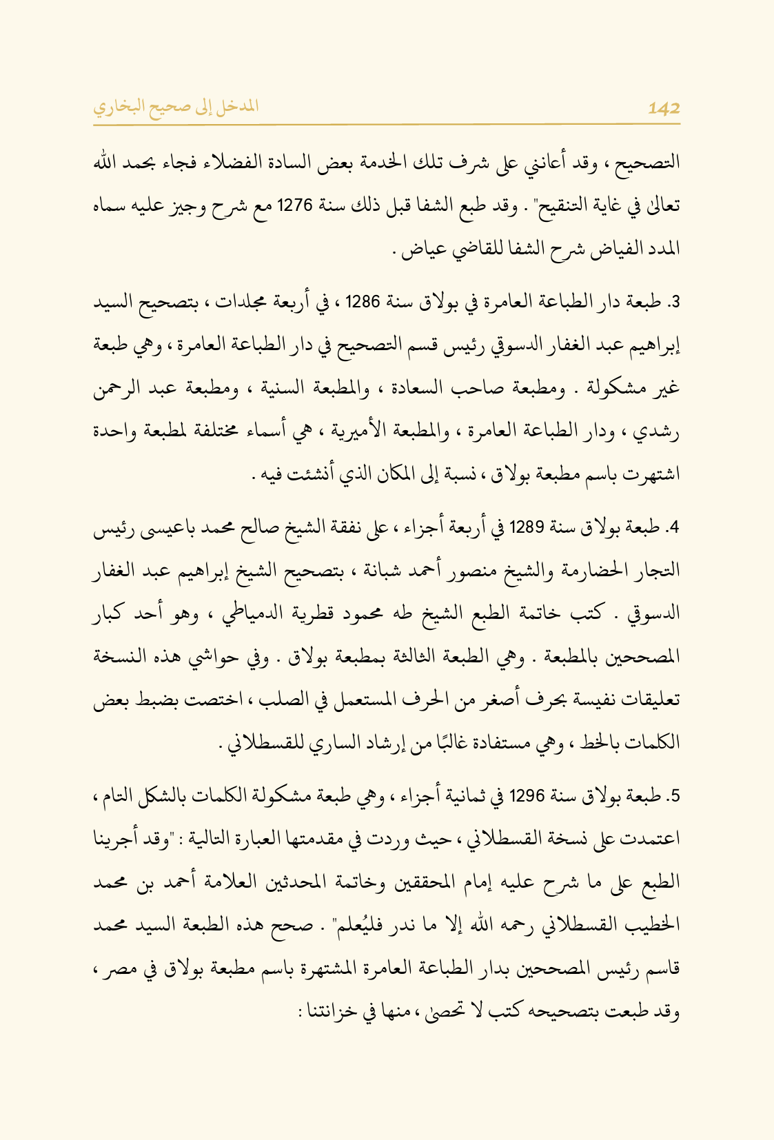 ٥. طبعة بولاق سنة ١٢٩٦ في ثمانية أجزاء، وهي طبعة مشكولة الكلمات بالشكل التام، اعتمدت على نسخة القسطلاني، حيث وردت في مقدمتها العبارة التالية: "وقد أجرينا الطبع على ما شرح عليه إمام المحققين وخاتمة المحدثين العلامة أحمد بن محمد الخطيب القسطلاني رحمه الله إلا ما ندر فليُعلم". صحح هذه الطبعة السيد محمد قاسم رئيس المصححين بدار الطباعة العامرة المشتهرة باسم مطبعة بولاق في مصر، وقد طبعت بتصحيحه كتب لا تحصى.، منها في خزانتنا: