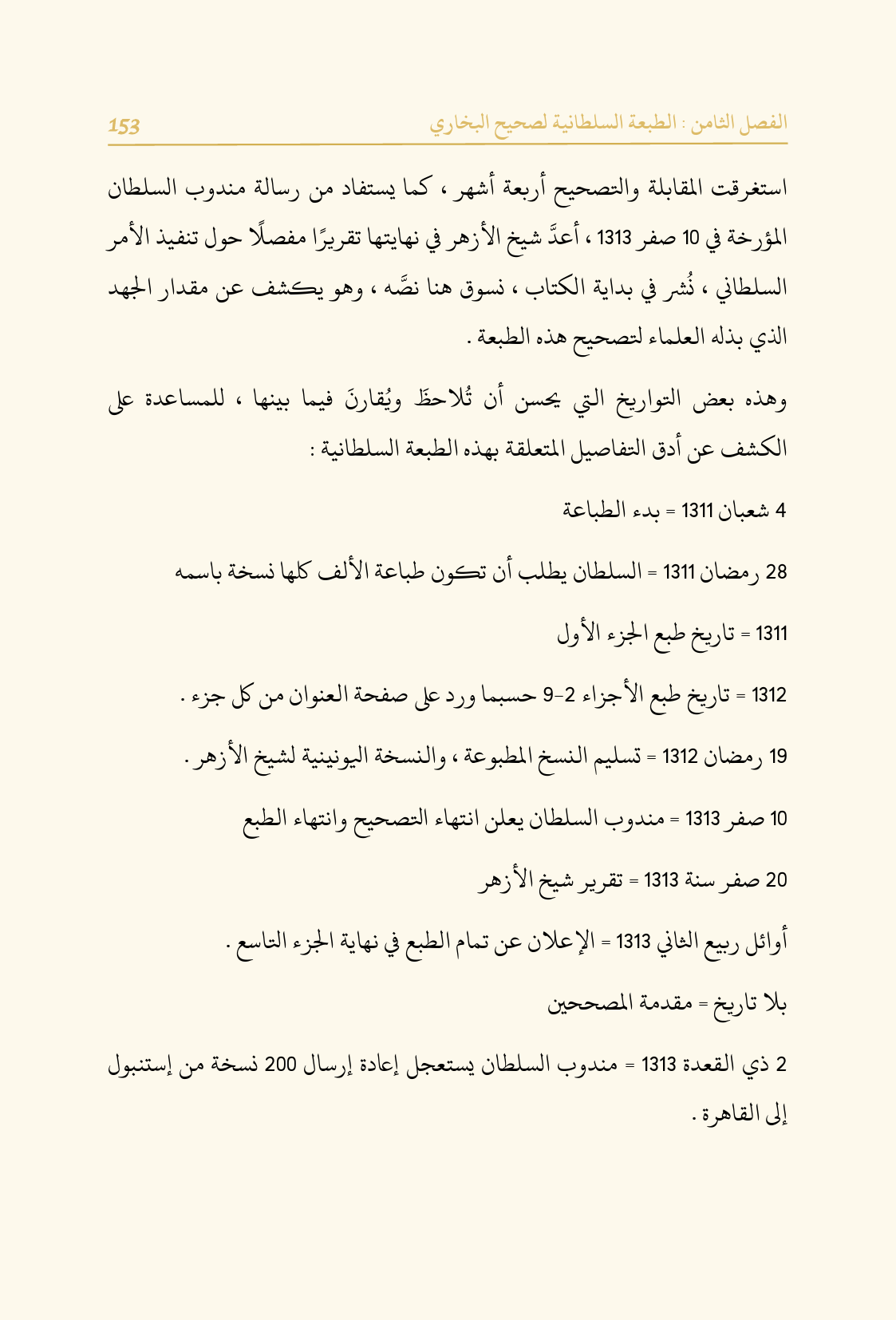 وهذه بعض التواريخ التي يحسن أن تُلاحظَ ويُقارنَ فيما بينها، للمساعدة على الكشف عن أدق التفاصيل المتعلقة بهذه الطبعة السلطانية: