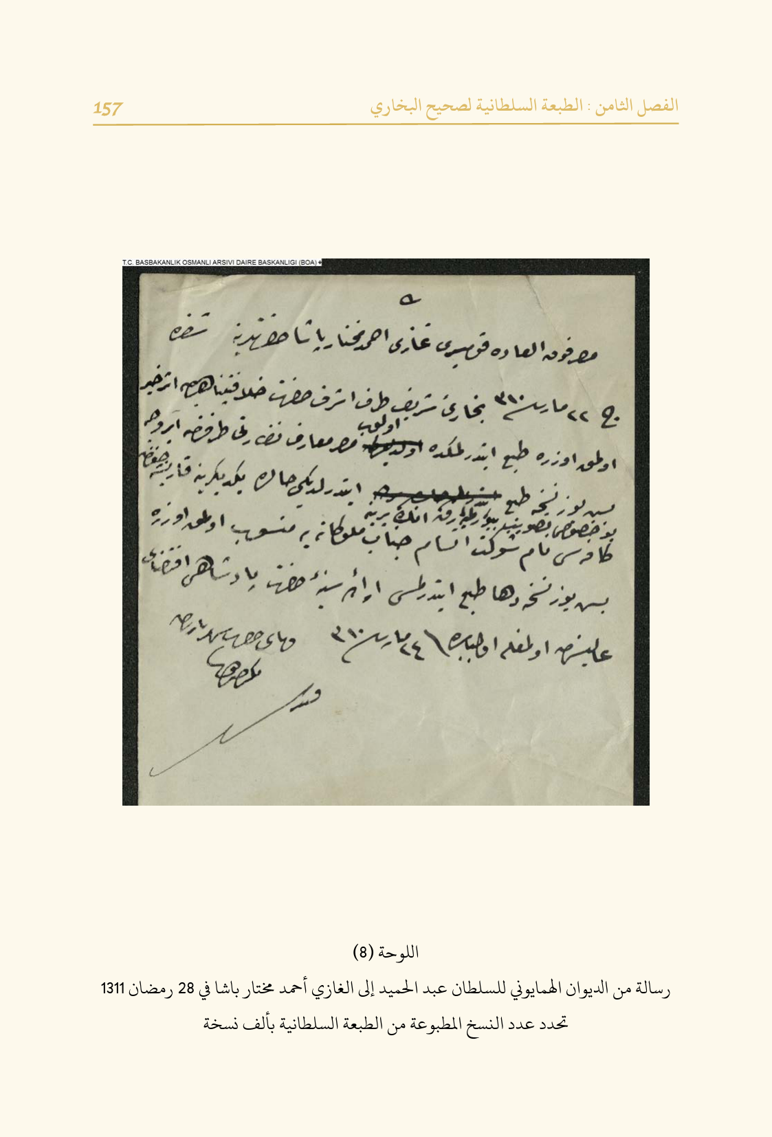 رسالة من الديوان الهمايوني للسلطان عبد الحميد إلى الغازي أحمد مختار باشا في ٢٨ رمضان ١٣١١ تحدد عدد النسخ المطبوعة من الطبعة السلطانية بألف نسخة