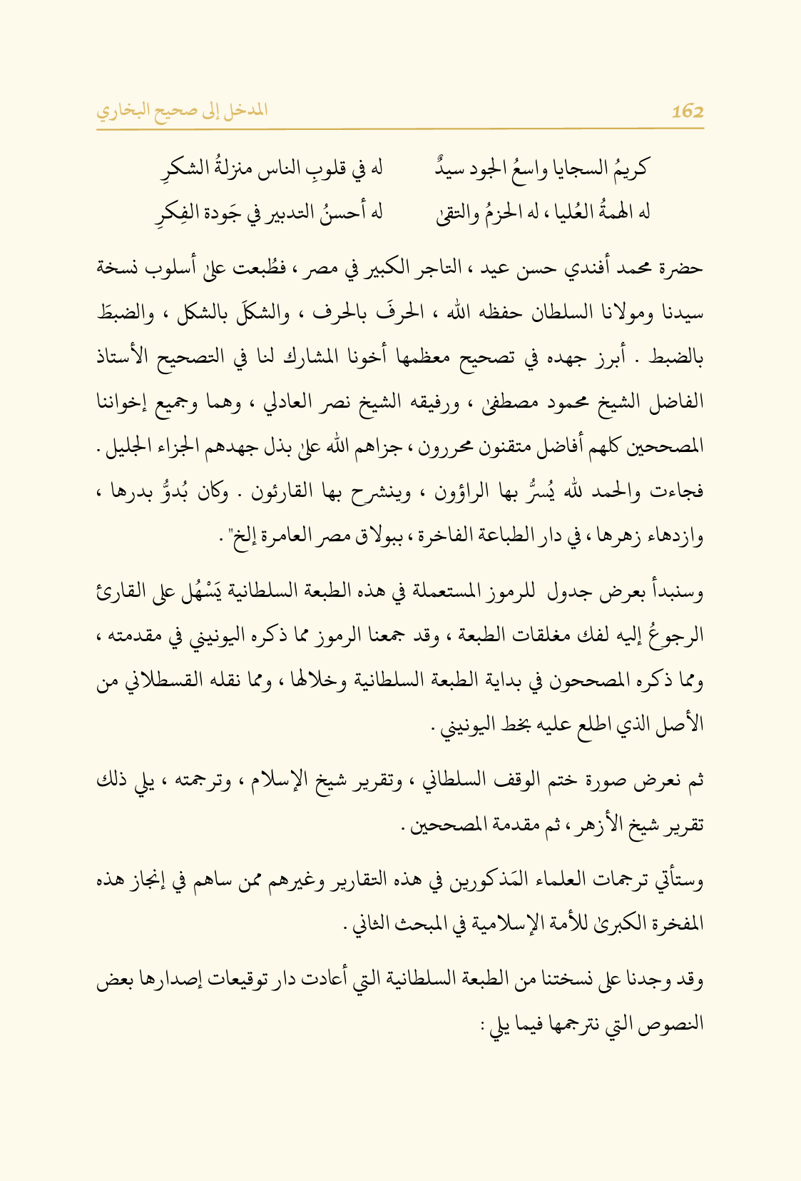 حضرة محمد أفندي حسن عيد، التاجر الكبير في مصر، فطُبعت على أسلوب نسخة سيدنا ومولانا السلطان حفظه الله، الحرفَ بالحرف، والشكلَ بالشكل، والضبطَ بالضبط. أبرز جهده في تصحيح معظمها أخونا المشارك لنا في التصحيح الأستاذ الفاضل الشيخ محمود مصطفى، ورفيقه الشيخ نصر العادلي، وهما وجميع إخواننا المصححين كلهم أفاضل متقنون محررون، جزاهم الله على بذل جهدهم الجزاء الجليل. فجاءت والحمد لله يُسرُّ بها الراؤون، وينشرح بها القارئون. وكان بُدوُّ بدرها، وازدهاء زهرها، في دار الطباعة الفاخرة، ببولاق مصر العامرة إلخ".