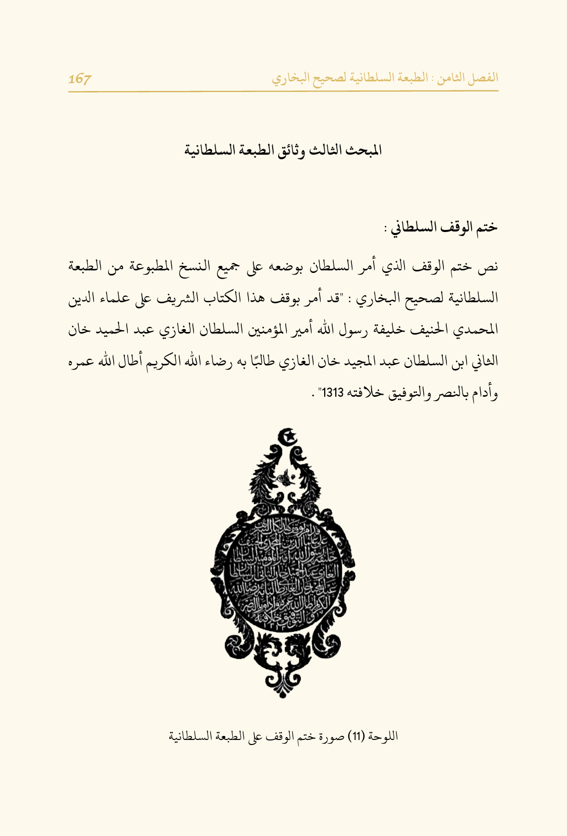 نص ختم الوقف الذي أمر السلطان بوضعه على جميع النسخ المطبوعة من الطبعة السلطانية لصحيح البخاري: "قد أمر بوقف هذا الكتاب الشريف على علماء الدين المحمدي الحنيف خليفة رسول الله أمير المؤمنين السلطان الغازي عبد الحميد خان الثاني ابن السلطان عبد المجيد خان الغازي طالبًا به رضاء الله الكريم أطال الله عمره وأدام بالنصر والتوفيق خلافته ١٣١٣".