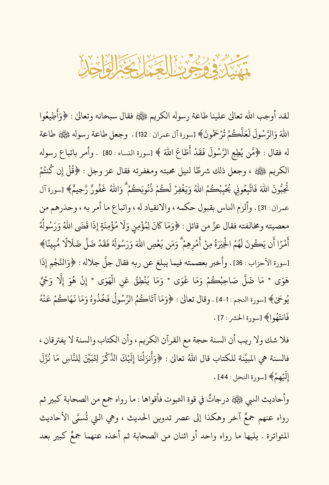 لقد أوجب الله تعالى علينا طاعة رسوله الكريم - صلى الله عليه وسلم - فقال سبحانه وتعالى: {وَأَطِيعُوا اللهَ وَالرَّسُولَ لَعَلَّكُمْ تُرْحَمُونَ} [سورة آل عمران: ١٣٢]. وجعل طاعة رسوله - صلى الله عليه وسلم - طاعة له فقال: {مَّن يُطِعِ الرَّسُولَ فَقَدْ أَطَاعَ اللهَ} [سورة النساء.: ٨٠]. وأمر باتباع رسوله الكريم - صلى الله عليه وسلم -.، وجعل ذلك شرطًا لنيل محبته ومغفرته فقال عز وجل: {قُلْ إِن كُنتُمْ تُحِبُّونَ اللهَ فَاتَّبِعُونِي يُحْبِبْكُمُ اللهُ وَيَغْفِرْ لَكُمْ ذُنُوبَكُمْ وَاللهُ غَفُورٌ رَّحِيمٌ} [سورة آل عمران: ٣١] .. وألزم الناس بقبول حكمه، والانقياد له، واتباع ما أمر به، وحذرهم من معصيته ومخالفته فقال عزَّ من قائل: {وَمَا كَانَ لِمُؤْمِنٍ وَلَا مُؤْمِنَةٍ إِذَا قَضَى اللهُ وَرَسُولُهُ أَمْرًا أَن يَكُونَ لَهُمُ الْخِيَرَةُ مِنْ أَمْرِهِمْ وَمَن يَعْصِ اللهَ وَرَسُولَهُ فَقَدْ ضَلَّ ضَلَالًا مُّبِينًا} [سورة الأحزاب: ٣٦]. وأخبر بعصمته فيما يبلغ عن ربه فقال جلَّ جلاله: {وَالنَّجْمِ إِذَا هَوَى * مَا ضَلَّ صَاحِبُكُمْ وَمَا غَوَى * وَمَا يَنْطِقُ عَنِ الْهَوَى * إِنْ هُوَ إِلَّا وَحْيٌ يُوحَى} [سورة النجم: ١ - ٤]. وقال تعالى: {وَمَا آتَاكُمُ الرَّسُولُ فَخُذُوهُ وَمَا نَهَاكُمْ عَنْهُ فَانتَهُوا} [سورة الحشر: ٧].