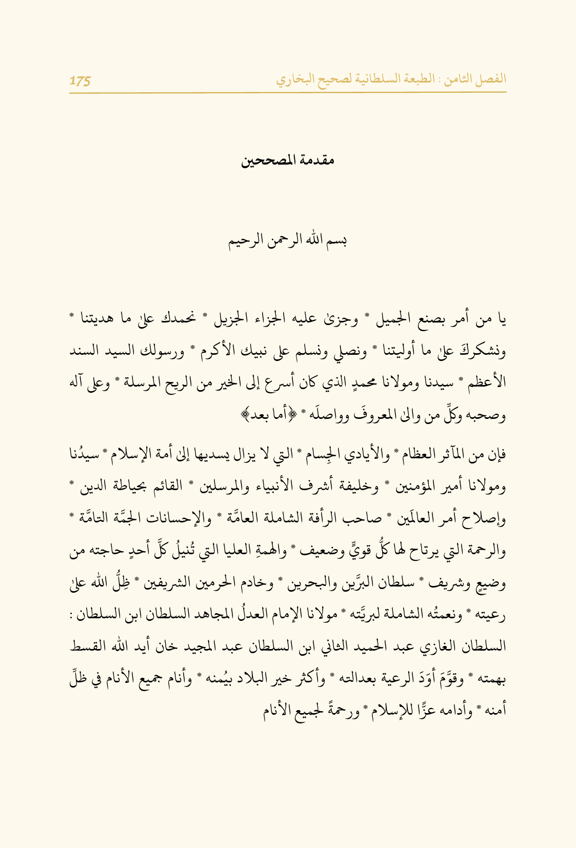 فإن من المآثر العظام * والأيادي الجِسام * التي لا يزال يسديها إلى أمة الإسلام * سيدُنا ومولانا أمير المؤمنين * وخليفة أشرف الأنبياء والمرسلين * القائم بحياطة الدين * وإصلاح أمر العالَمين * صاحب الرأفة الشاملة العامَّة * والإحسانات الجمَّة التامَّة * والرحمة التي يرتاح لها كلُّ قويٍّ وضعيف * والهمةِ العليا التي تُنيلُ كلَّ أحدٍ حاجته من وضيعٍ وشريف * سلطان البرَّين والبحرين * وخادم الحرمين الشريفين * ظِلُّ الله على رعيته * ونعمتُه الشاملة لبريَّته * مولانا الإمام العدلُ المجاهد السلطان ابن السلطان: السلطان الغازي عبد الحميد الثاني ابن السلطان عبد المجيد خان أيد الله القسط بهمته * وقوَّمَ أوَدَ الرعية بعدالته * وأكثر خير البلاد بيُمنه * وأنام جميع الأنام في ظلِّ أمنه * وأدامه عزًّا للإسلام * ورحمةً لجميع الأنام
