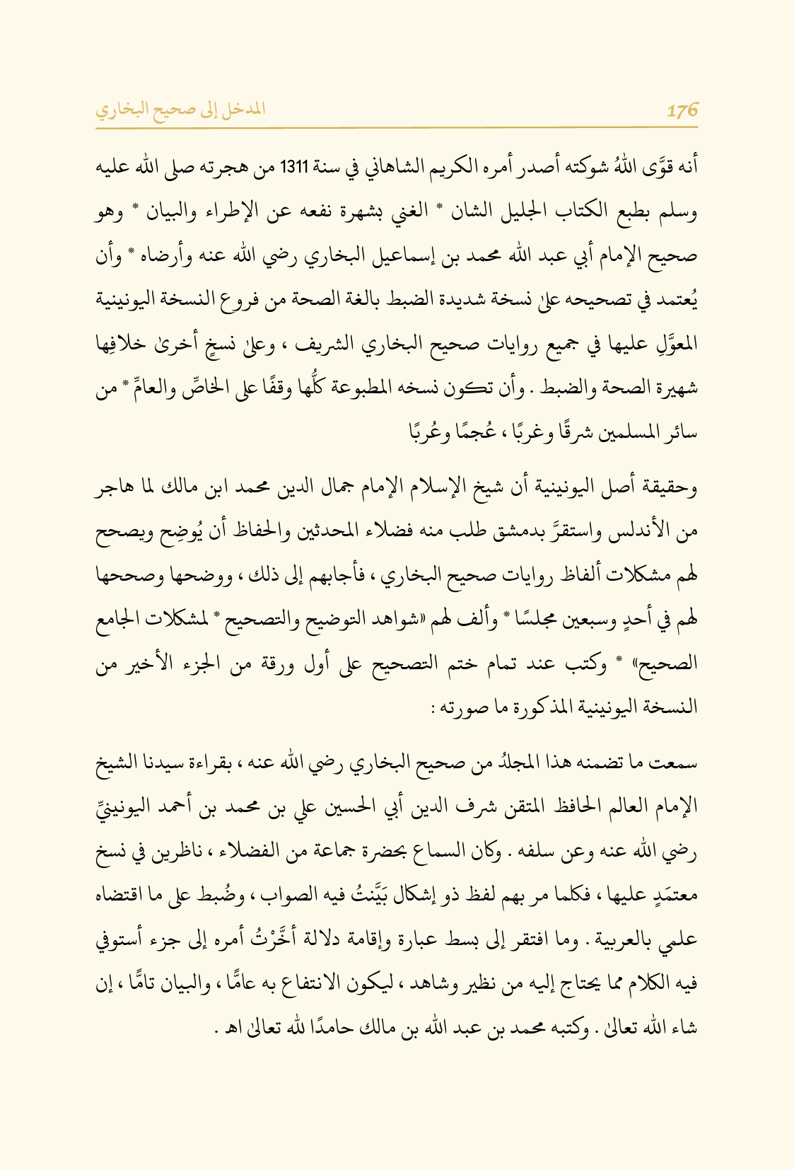 أنه قوَّى اللهُ شوكته أصدر أمره الكريم الشاهاني في سنة ١٣١١ من هجرته صلى الله عليه وسلم بطبع الكتاب الجليل الشان * الغني بشهرة نفعه عن الإطراء والبيان * وهو صحيح الإمام أبي عبد الله محمد بن إسماعيل البخاري رضي الله عنه وأرضاه * وأن يُعتمد في تصحيحه على نسخة شديدة الضبط بالغة الصحة من فروع النسخة اليونينية المعوَّلِ عليها في جميع روايات صحيح البخاري الشريف، وعلى نسخٍ أخرى خلافِها شهيرة الصحة والضبط. وأن تكون نسخه المطبوعة كلُّها وقفًا على الخاصِّ والعامِّ * من سائر المسلمين شرقًا وغربًا، عُجمًا وعُربًا