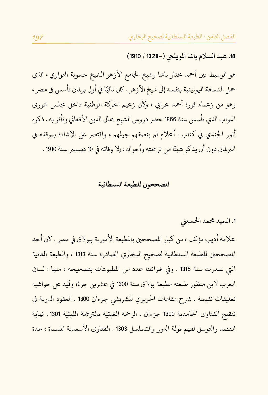 علامة أديب مؤلف، من كبار المصححين بالمطبعة الأميرية ببولاق في مصر. كان أحد المصححين للطبعة السلطانية لصحيح البخاري الصادرة سنة ١٣١٣، والطبعة الثانية التي صدرت سنة ١٣١٥. وفي خزانتنا عدد من المطبوعات بتصحيحه، منها: لسان العرب لابن منظور طبعته مطبعة بولاق سنة ١٣٠٠ في عشرين جزءًا وقَيد على حواشيه تعليقات نفيسة. شرح مقامات الحريري للشريشي جزءان ١٣٠٠. العقود الدرية في تنقيح الفتاوى الحامدية ١٣٠٠ جزءان. الرحمة الغيثية بالترجمة الليثية ١٣٠١ .. نهاية القصد والتوسل لفهم قولة الدور والتسلسل ١٣٠٣. الفتاوى الأسعدية المسماة: عدة