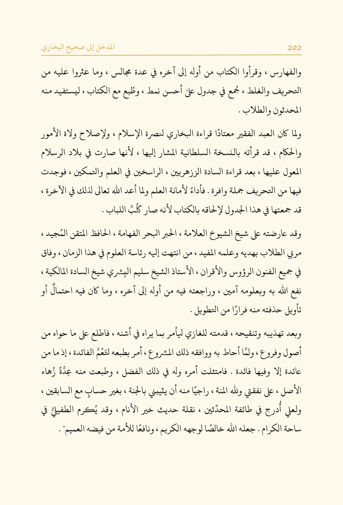 وبعد تهذيبه وتنقيحه، قدمته للغازي ليأمر بما يراه في أشنه، فاطلع على ما حواه من أصول وفروع، ولمَّا أحاط به ووافقه ذلك المشروع، أمر بطبعه لتَعُمَّ الفائدة، إذ ما من عائدة إلا وفيها فائدة. فامتثلت أمره وله في ذلك الفضل، وطبعت منه عِدَّةً زُهاء الأصل، على نفقتي ولله المنة، راجيًا منه أن يثيبني بالجنة، بغير حسابٍ مع السابقين، ولعلي أُدرج في طائفة المحدِّثين، نقلة حديث خير الأنام، وقد يُكرم الطفيليُّ في ساحة الكرام. جعله الله خالصًا لوجهه الكريم، ونافعًا للأمة من فيضه العميم".