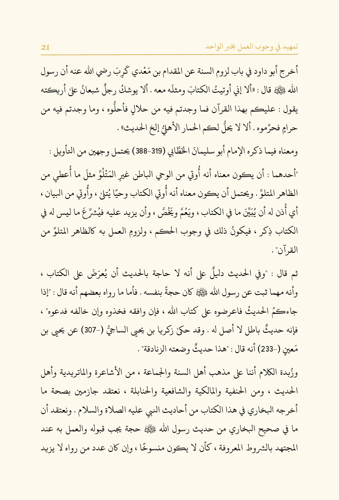أخرج أبو داود في باب لزوم السنة عن المقدام بن مَعْدي كَرِبَ رضي الله عنه أن رسول الله - صلى الله عليه وسلم - قال: «ألا إني أوتيتُ الكتابَ ومثلَه معه. ألا يوشكُ رجلٌ شبعانُ على أريكته يقول: عليكم بهذا القرآن فما وجدتم فيه من حلالٍ فأحلُّوه، وما وجدتم فيه من حرامٍ فحرِّموه. ألا لا يحلُّ لكم الحمار الأهليُّ إلخ الحديث».