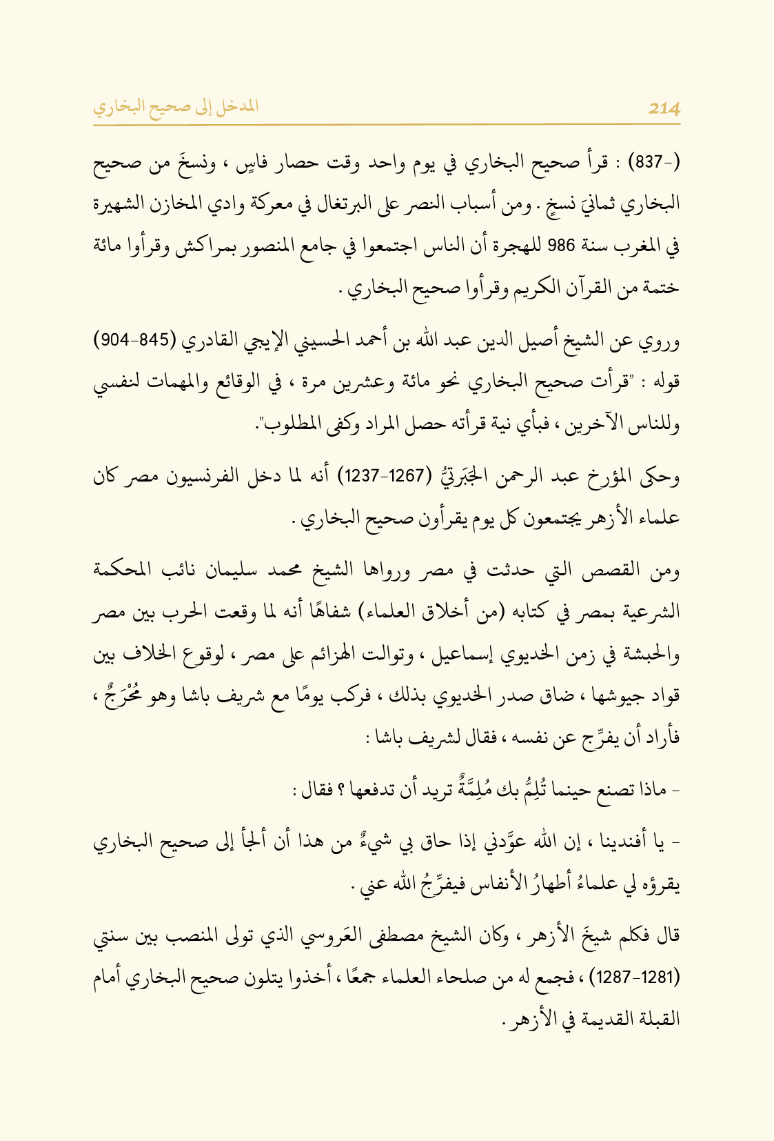 وحكى المؤرخ عبد الرحمن الجَبَرتيُّ (١٢٦٧ - ١٢٣٧) أنه لما دخل الفرنسيون مصر كان علماء الأزهر يجتمعون كل يوم يقرأون صحيح البخاري.