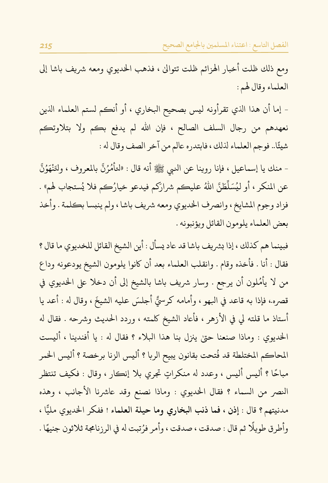 - منك يا إسماعيل، فإنا روينا عن النبي - صلى الله عليه وسلم - أنه قال: «لتأمُرُنَّ بالمعروف، ولتَنْهَوُنَّ عن المنكر، أو ليُسَلِّطَنَّ اللهُ عليكم شرارَكم فيدعو خيارُكم فلا يُستجاب لهم». فزاد وجوم المشايخ، وانصرف الخديوي ومعه شريف باشا، ولم ينبسا بكلمة. وأخذ بعض العلماء يلومون القائل ويؤنبونه.