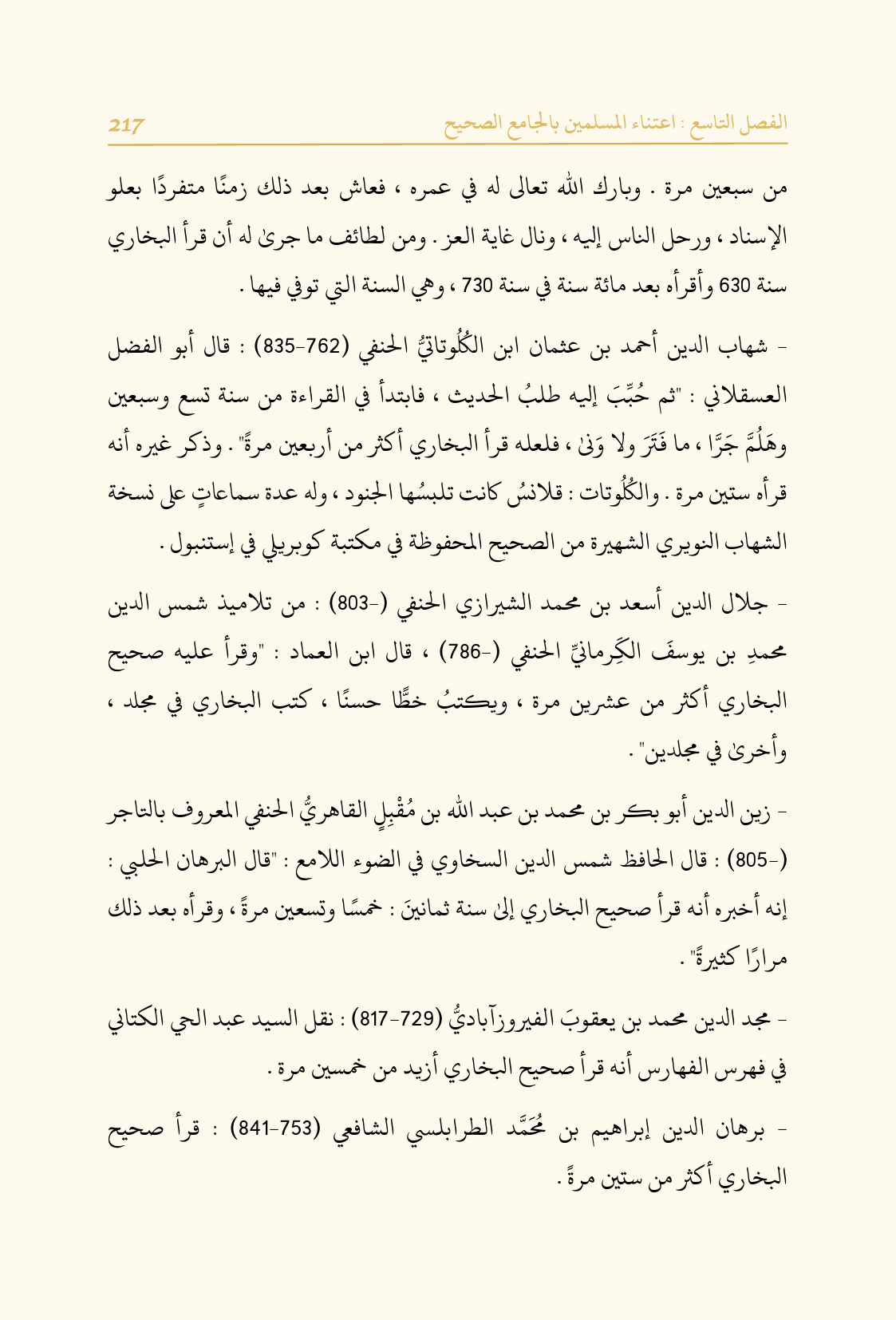 - شهاب الدين أحمد بن عثمان ابن الكُلُوتاتيُّ الحنفي (٧٦٢ - ٨٣٥): قال أبو الفضل العسقلاني: "ثم حُبِّبَ إليه طلبُ الحديث، فابتدأ في القراءة من سنة تسع وسبعين وهَلُمَّ جَرَّا، ما فَتَرَ ولا وَنى، فلعله قرأ البخاري أكثر من أربعين مرةً". وذكر غيره أنه قرأه ستين مرة. والكُلُوتات: قلانسُ كانت تلبسُها الجنود، وله عدة سماعاتٍ على نسخة الشهاب النويري الشهيرة من الصحيح المحفوظة في مكتبة كوبريلي في إستنبول.