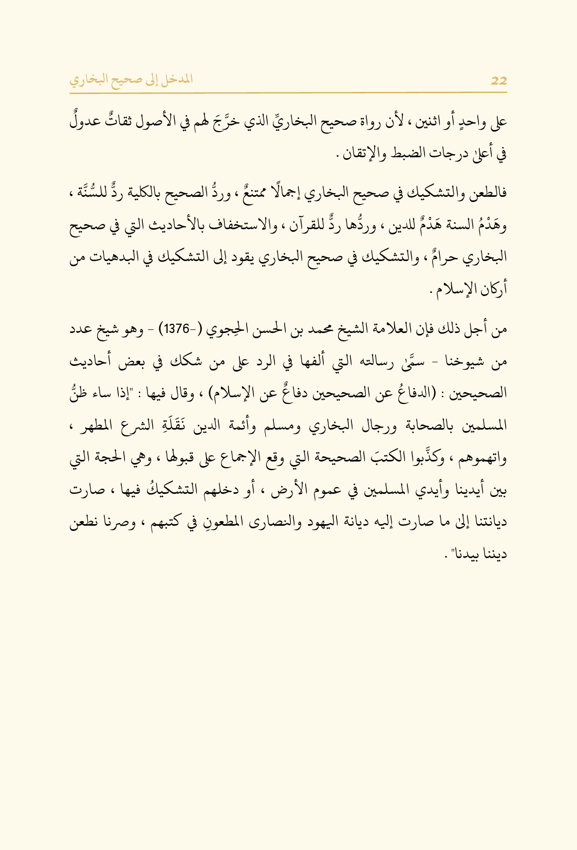 من أجل ذلك فإن العلامة الشيخ محمد بن الحسن الحِجوي (-١٣٧٦) - وهو شيخ عدد من شيوخنا - سمَّى رسالته التي ألفها في الرد على من شكك في بعض أحاديث الصحيحين: (الدفاعُ عن الصحيحين دفاعٌ عن الإسلام)، وقال فيها: "إذا ساء ظنُّ المسلمين بالصحابة ورجال البخاري ومسلم وأئمة الدين نَقَلَةِ الشرع المطهر، واتهموهم، وكذَّبوا الكتبَ الصحيحة التي وقع الإجماع على قبولها، وهي الحجة التي بين أيدينا وأيدي المسلمين في عموم الأرض، أو دخلهم التشكيكُ فيها، صارت ديانتنا إلى ما صارت إليه ديانة اليهود والنصارى المطعونِ في كتبهم، وصرنا نطعن ديننا بيدنا".