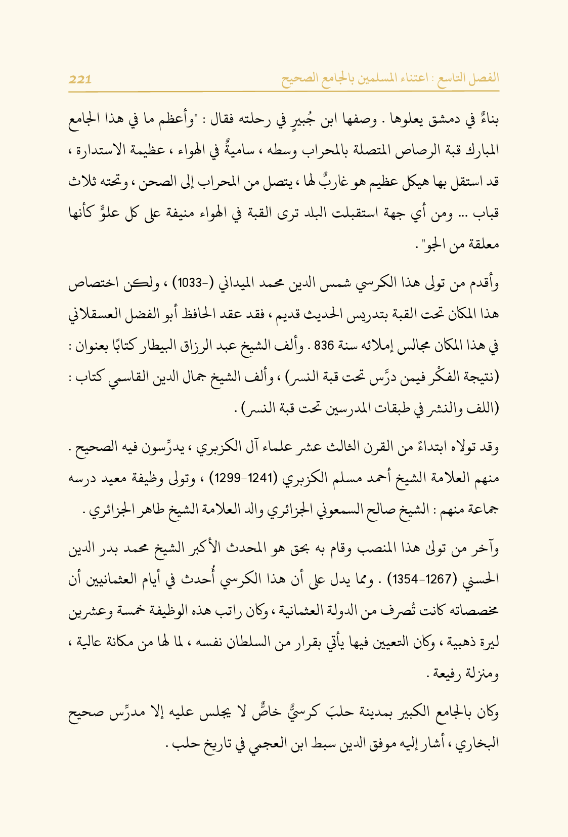 وكان بالجامع الكبير بمدينة حلبَ كرسيٌّ خاصٌّ لا يجلس عليه إلا مدرِّس صحيح البخاري، أشار إليه موفق الدين سبط ابن العجمي في تاريخ حلب.